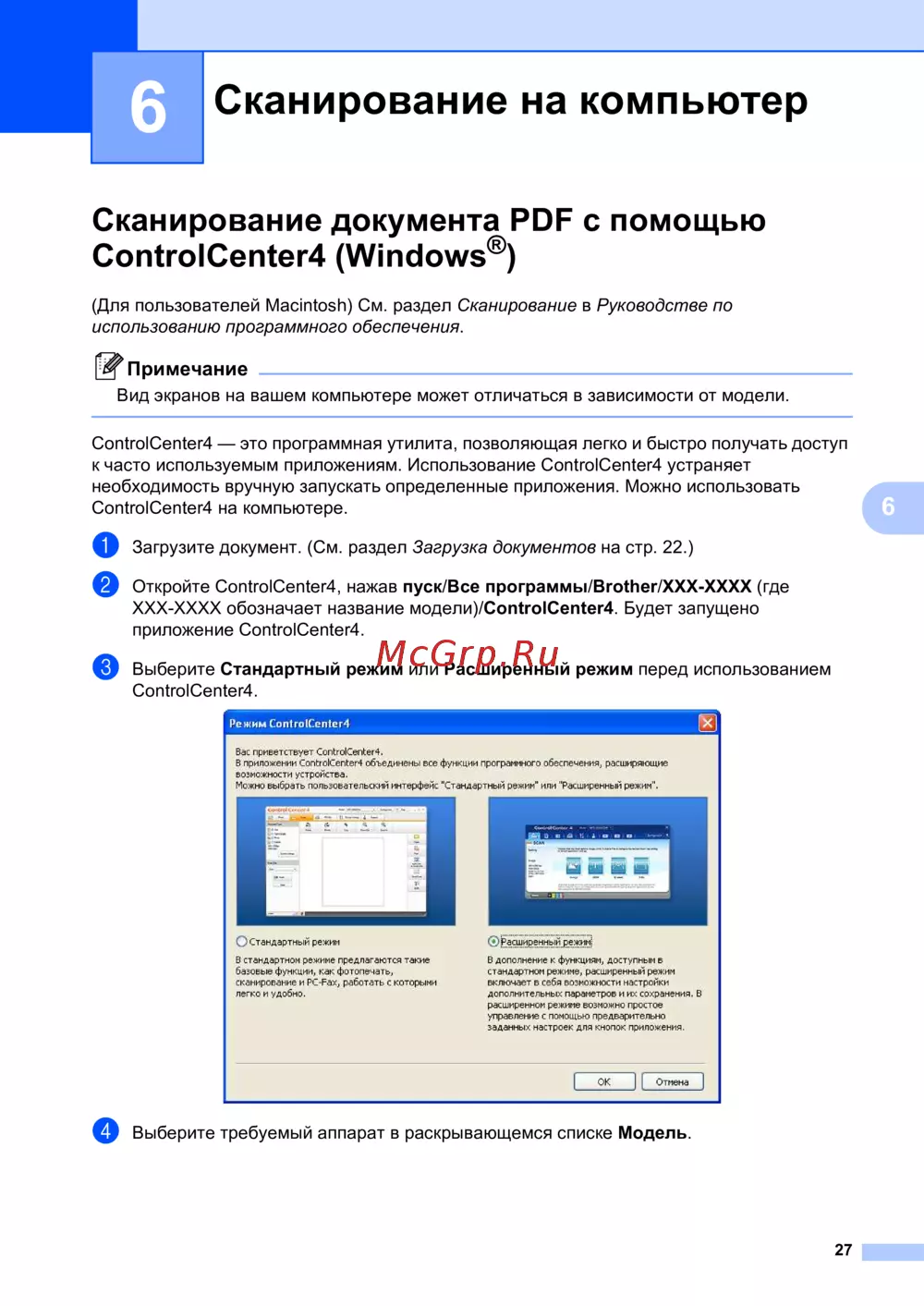 XXX-XXXX обозначает название модели)/ControlCenter4. Будет запущено