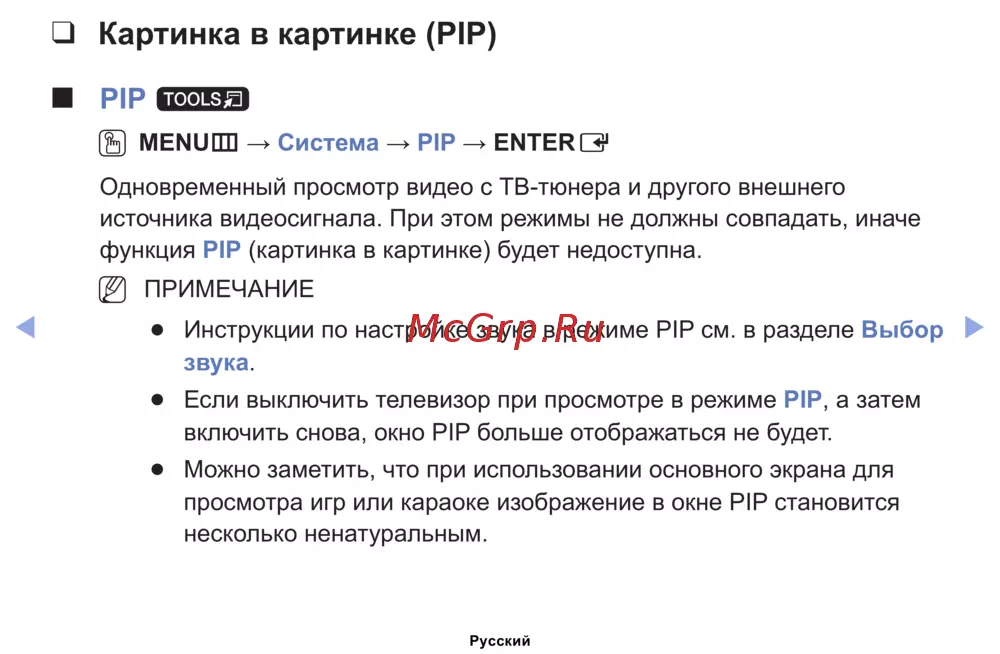 Инструкции по настройке звука в режиме PIP см. в разделе Выбор