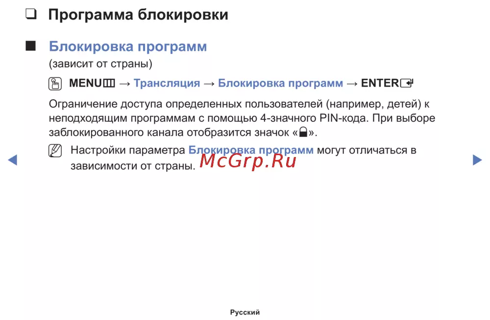 → Трансляция → Блокировка программ → ENTER