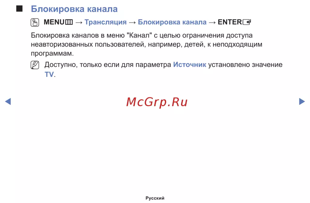→ Трансляция → Блокировка канала → ENTER