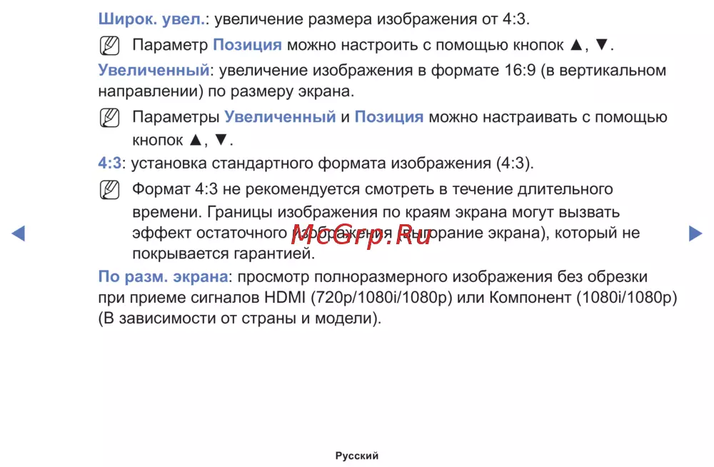 Узнайте, как настроить параметры изображения, включая увеличение и выбор формата 4:3 или 16:9 для оптимального просмотра. Избегайте выгорания экрана.