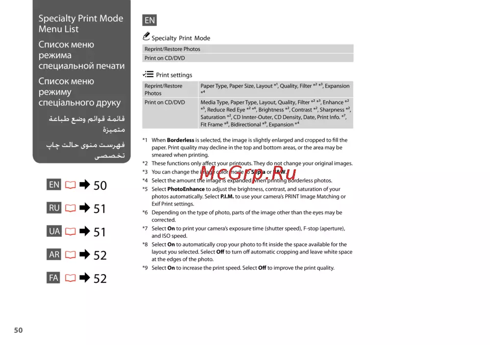 Epson Stylus TX650 — список меню режима специальной печати и настройки печати [50/88]
