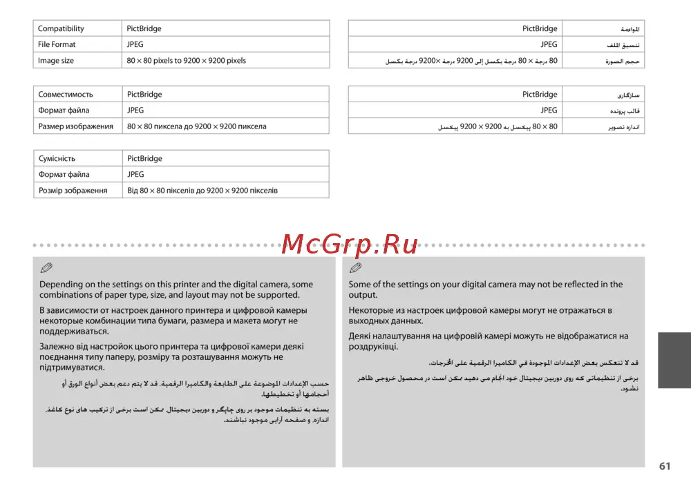 Узнайте о совместимости PictBridge и формате JPEG для печати изображений. Поддерживаемые размеры от 80x80 до 9200x9200 пикселей и возможные ограничения.