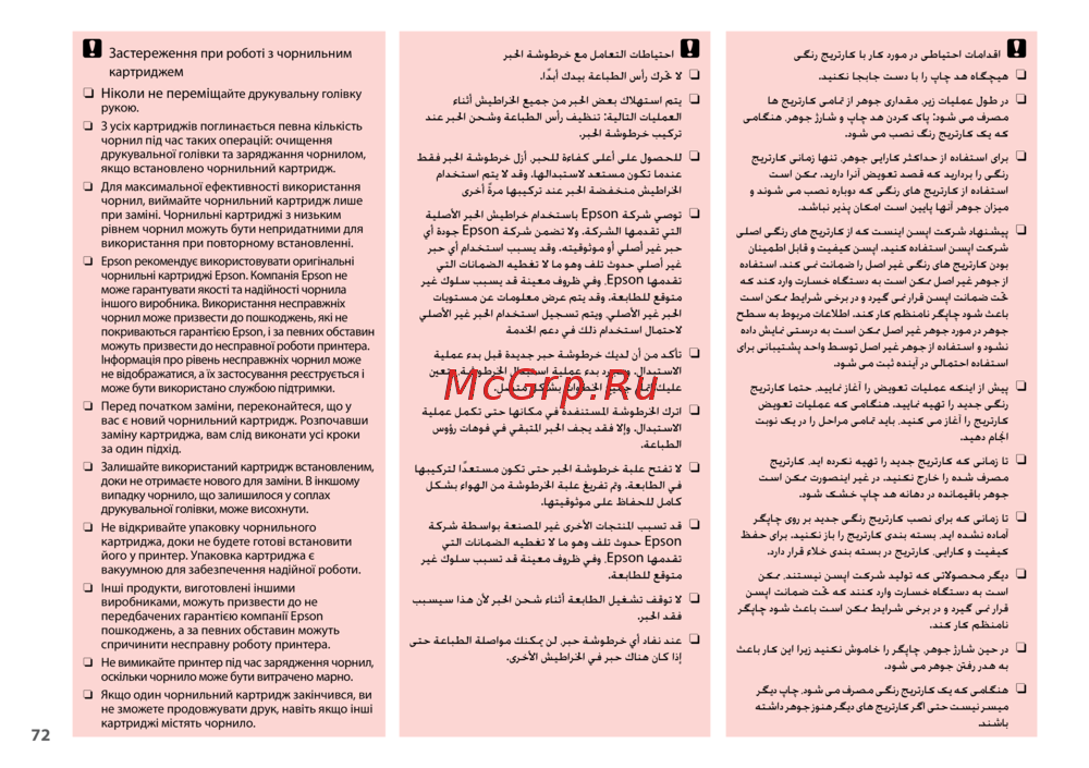 Epson Stylus TX650 — застереження при роботі з чорнильними картриджами для принтерів [72/88]