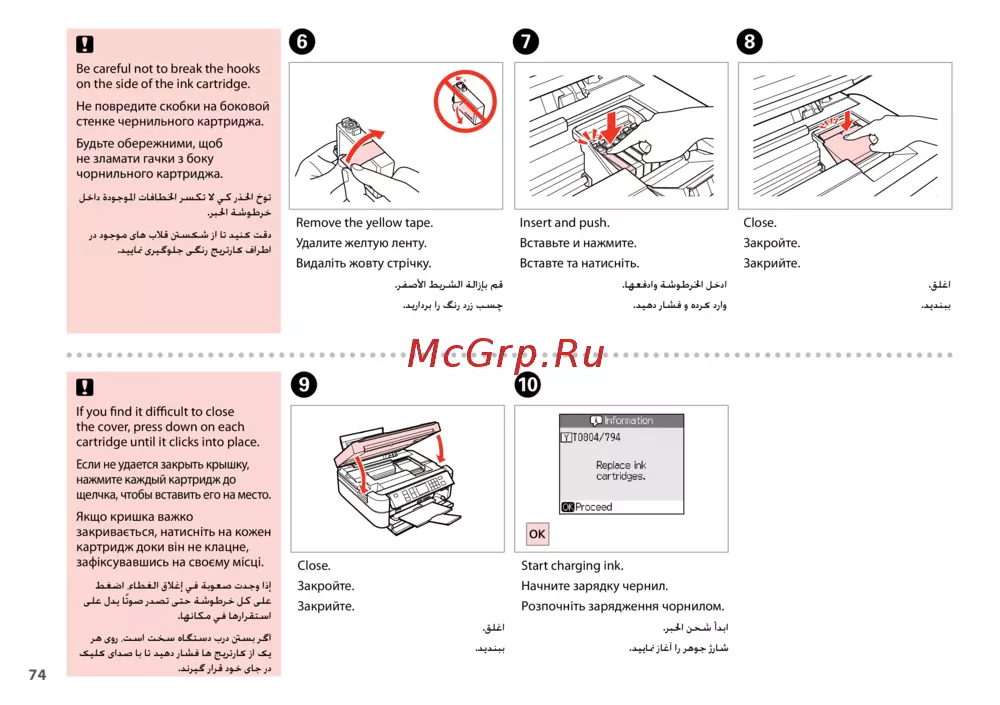 - Меры предосторожности при работе с чернильными картриджами p.71