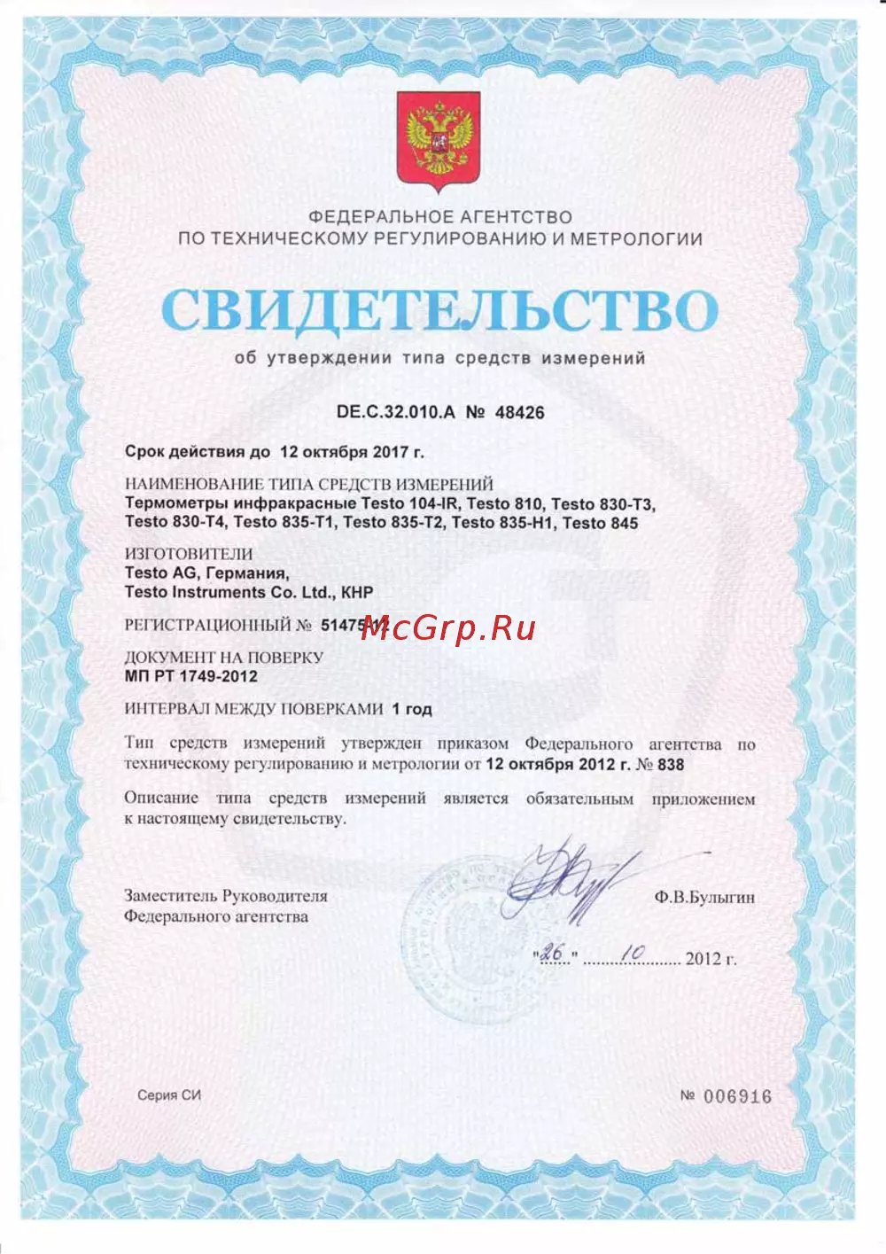 ФЕДЕРАЛЬНОЕ АГЕНТСТВО ПО ТЕХНИЧЕСКОМУ РЕГУЛИРОВАНИЮ И МЕТРОЛОГИИ СВИДЕТЕЛЬСТВО об утверждении типа средств измерений DE C 32 010 A 48426 Срок действия до 12 октября 2017 г НАИМЕНОВАНИЕ ТИПА СРЕДСТВ ИЗМЕРЕНИЙ Термометры инфракрасные Testo 104 IR Testo 810 Testo 830 T3 Testo 830 T4 Testo 835 T1 Testo 835 T2 Testo 835 H1 Testo 845 ИЗГОТОВИТЕЛИ Testo AG Германия Testo Instruments Co Ltd КНР РЕГИСТРАЦИОННЫЙ 51475 12 ДОКУМЕНТ НА ПОВЕРКУ МП РТ 1749 2012 ИНТЕРВАЛ МЕЖДУ ПОВЕРКАМИ 1 год Тип средств измерений утвержден приказом Федерального агентства по техническому регулированию и метрологии от 12 октября 2012 г 838 Описание типа средств измерений является обязательным приложением к настоящему свидетельству Заместитель Руководителя Федерального агентства Ф В Булыгин 2012 г Серия СИ 006916