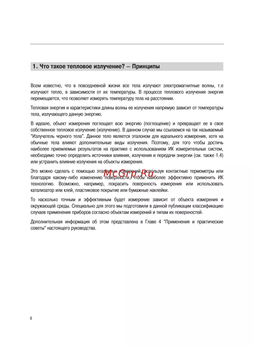 1 Что такое тепловое излучение Принципы Всем известно что в повседневной жизни все тела излучают электромагнитные волны т е излучают тепло в зависимости от их температуры В процессе теплового излучения энергия перемещается что позволяет измерять температуру тела на расстоянии Тепловая энергия и характеристики длины волны ее излучения напрямую зависит от температуры тела излучающего данную энергию В идеале объект измерения поглощает всю энергию поглощение и превращает ее в свое собственное тепловое излучение излучение В данном случае мы ссылаемся на так называемый Излучатель черного тела Данное тело является эталоном для идеального измерения хотя на обычные тела влияют дополнительные виды излучения Поэтому для того чтобы достичь наиболее приемлемых результатов на практике с использованием ИК измерительных систем необходимо точно определить источники влияния излучения и передачи энергии см также 1 4 или устранить влияние излучения на объекты измерения Это можно сделать с помощью эталонных измерений используя контактные термометры или благодаря какому либо изменению поверхности чтобы наиболее эффективно применить ИК технологию Возможно например покрасить поверхность измерения или использовать катализатор или клей пластиковое покрытие или бумажные наклейки То насколько точным и эффективным будет измерение зависит от объекта измерения и окружающей среды Специально для этого мы подготовили в данной публикации классификацию случаев применения приборов согласно объектам измерений и типам их поверхностей Дополнительная информация об этом представлена в Главе 4 Применения и практические советы настоящего руководства 6