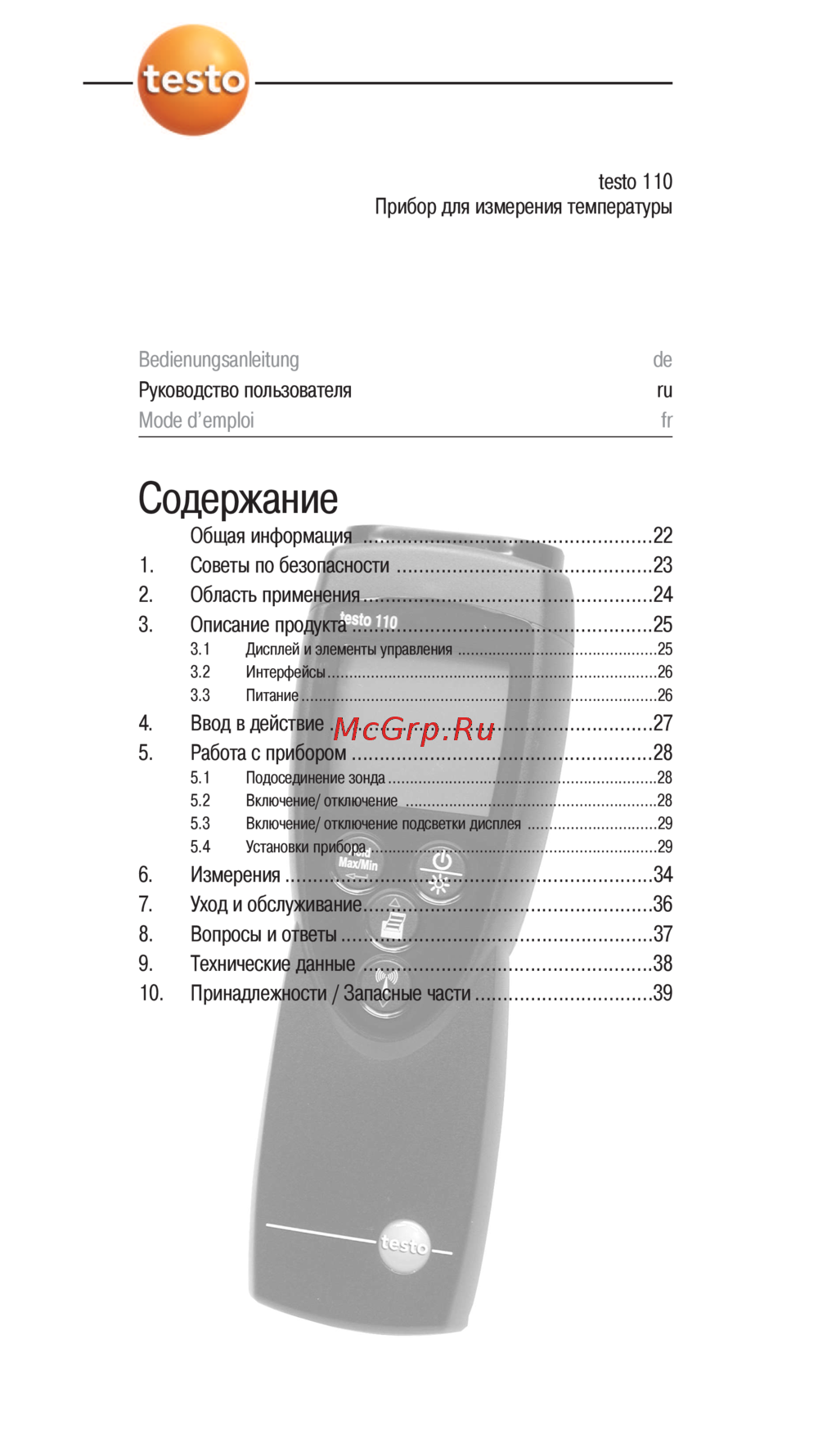 testo 110 Прибор для измерения температуры Bedienungsanleitung de Руководство пользователя ru Mode d emploi fr Содержание Общая информация i Советы по безопасности 2 Область применения 3 Описание продукта 3 1 Дисплей и элементы управления 3 2 Интерфейсы 3 3 Питание 4 Ввод в действие 5 Работа с прибором Подосе зонда Включение отключение Включение отключение подсветки дисплея Установки прибора 6 Измерения 7 Уход и обслуживание 8 Вопросы и ответы 9 Технические данные 10 Принадлежности Запасные части