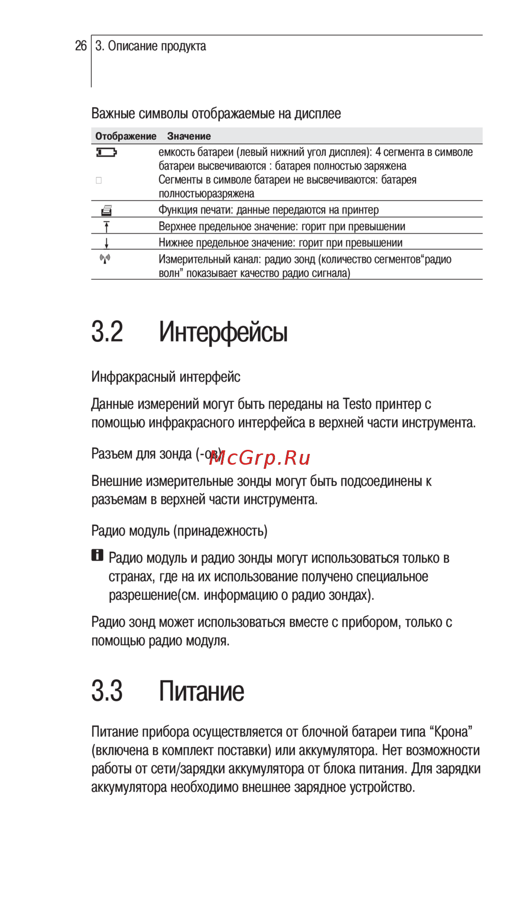26 3 Описание продукта Важные символы отображаемые на дисплее Отображени Значение О емкость батареи левый нижний угол дисплея 4 сегмента в символе батареи высвечиваются батарея полностью заряжена Сегменты в символе батареи не высвечиваются батарея полностьюразряжена а Функция печати данные передаются на принтер Т Верхнее предельное значение горит при превышении 1 Нижнее предельное значение горит при превышении Измерительный канал радио зонд количество сегментов радио волн показывает качество радио сигнала 3 2 Интерфейсы Инфракрасный интерфейс Данные измерений могут быть переданы на Testo принтер с помощью инфракрасного интерфейса в верхней части инструмента Разъем для зонда ов Внешние измерительные зонды могут бьпь подсоединены к разъемам в верхней части инструмента Радио модуль лринадежность Н Радио модуль и радио зонды могут использоваться только в странах где на их использование получено специальное разрешение см информацию о радио зондах Радио зонд может использоваться вместе с прибором только с помощью радио модуля 3 3 Питание Питание прибора осуществляется от блочной батареи типа Крона включена в комплект поставки или аккумулятора Нет возможности работы от сети зарядки аккумулятора от блока питания Для зарядки аккумулятора необходимо внешнее зарядное устройство