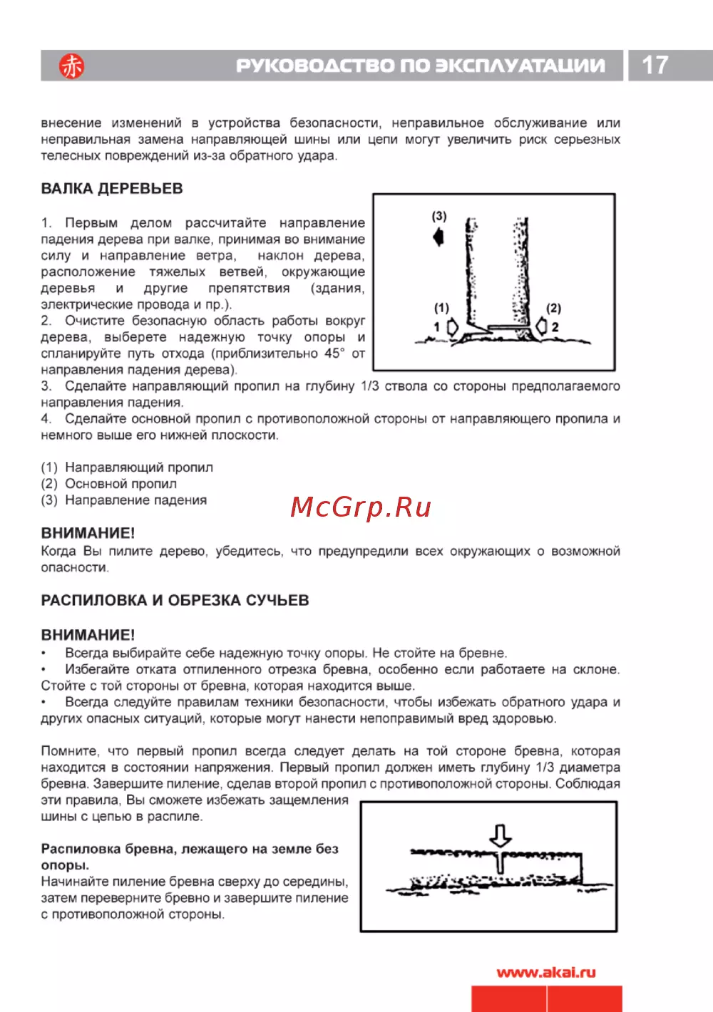 РУКОВОДСТВО ПО ЭКСПЛУАТАЦИИ I 17 внесение изменений в устройства безопасности неправильное обслуживание или неправильная замена направляющей шины или цепи могут увеличить риск серьезных телесных повреждений из за обратного удара ВАЛКА ДЕРЕВЬЕВ 1 Первым делом рассчитайте направление падения дерева при валке принимая во внимание силу и направление ветра наклон дерева расположение тяжелых ветвей окружающие деревья и другие препятствия здания электрические провода и пр 2 Очистите безопасную область работы вокруг дерева выберете надежную точку опоры и спланируйте путь отхода приблизительно 45 от направления падения дерева 3 Сделайте направляющий пропил на глубину 1 3 ствола со стороны предполагаемого направления падения 4 Сделайте основной пропил с противоположной стороны от направляющего пропила и немного выше его нижней плоскости 1 Направляющий пропил 2 Основной пропил 3 Направление падения ВНИМАНИЕ Когда Вы пилите дерево убедитесь что предупредили всех окружающих о возможной опасности РАСПИЛОВКА И ОБРЕЗКА СУЧЬЕВ ВНИМАНИЕ Всегда выбирайте себе надежную точку опоры Не стойте на бревне Избегайте отката отпиленного отрезка бревна особенно если работаете на склоне Стойте с той стороны от бревна которая находится выше Всегда следуйте правилам техники безопасности чтобы избежать обратного удара и других опасных ситуаций которые могут нанести непоправимый вред здоровью Помните что первый пропил всегда следует делать на той стороне бревна которая находится в состоянии напряжения Первый пропил должен иметь глубину 1 3 диаметра бревна Завершите пиление сделав второй пропил с противоположной стороны Соблюдая эти правила Вы сможете избежать защемления шины с цепью в распиле Распиловка бревна лежащего на земле без опоры Начинайте пиление бревна сверху до середины затем переверните бревно и завершите пиление с противоположной стороны www akai ru