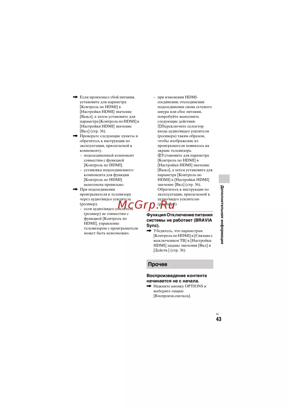 Sony BDP-S5500/BM [43/104] Функция отключение питания системы не работает bravia sync