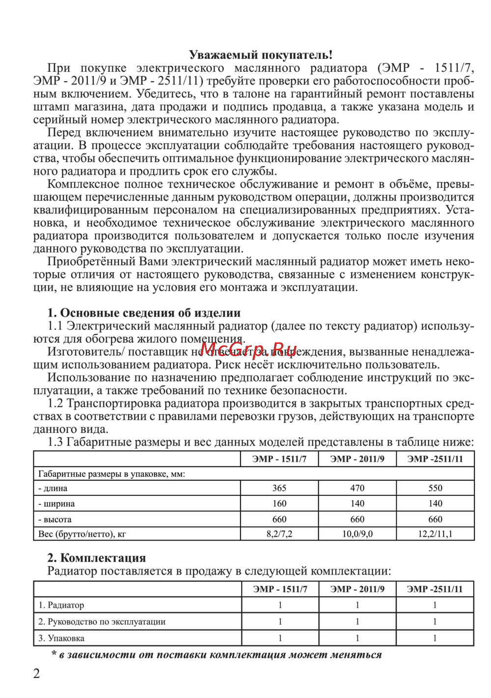 Уважаемый покупатель При покупке электрического маслянного радиатора ЭМР 1511 7 ЭМР 2011 9 и ЭМР 2511 11 требуйте проверки его работоспособности проб ным включением Убедитесь что в талоне на гарантийный ремонт поставлены штамп магазина дата продажи и подпись продавца а также указана модель и серийный номер электрического маслянного радиатора Перед включением внимательно изучите настоящее руководство по эксплу атации В процессе эксплуатации соблюдайте требования настоящего руковод ства чтобы обеспечить оптимальное функционирование электрического маслян ного радиатора и продлить срок его службы Комплексное полное техническое обслуживание и ремонт в объёме превы шающем перечисленные данным руководством операции должны производится квалифицированным персоналом на специализированных предприятиях Уста новка и необходимое техническое обслуживание электрического маслянного радиатора производится пользователем и допускается только после изучения данного руководства по эксплуатации Приобретённый Вами электрический маслянный радиатор может иметь неко торые отличия от настоящего руководства связанные с изменением конструк ции не влияющие на условия его монтажа и эксплуатации 1 Основные сведения об изделии 1 1 Электрический маслянный радиатор далее по тексту радиатор использу ются для обогрева жилого помещения Изготовитель поставщик не отвечает за повреждения вызванные ненадлежа щим использованием радиатора Риск несёт исключительно пользователь Использование по назначению предполагает соблюдение инструкций по экс плуатации а также требований по технике безопасности 1 2 Транспортировка радиатора производится в закрытых транспортных сред ствах в соответствии с правилами перевозки грузов действующих на транспорте данного вида 1 3 Габаритные размеры и вес данных моделей представлены в таблице ниже ЭМР 1511 7 ЭМР 2011 9 ЭМР 2511 11 длина 365 470 550 ширина 160 140 140 Габаритные размеры в упаковке мм высота Вес брутто нетто кг 660 660 660 8 2 7 2 10 0 9 0 12 2 11 1 2 Комплектация Радиатор поставляется в продажу в следующей комплектации ЭМР 1511 7 ЭМР 2011 9 ЭМР 2511 11 1 Радиатор 1 1 1 2 Руководство по эксплуатации 1 1 1 3 Упаковка 1 1 1 в зависимости от поставки комплектация может меняться 2