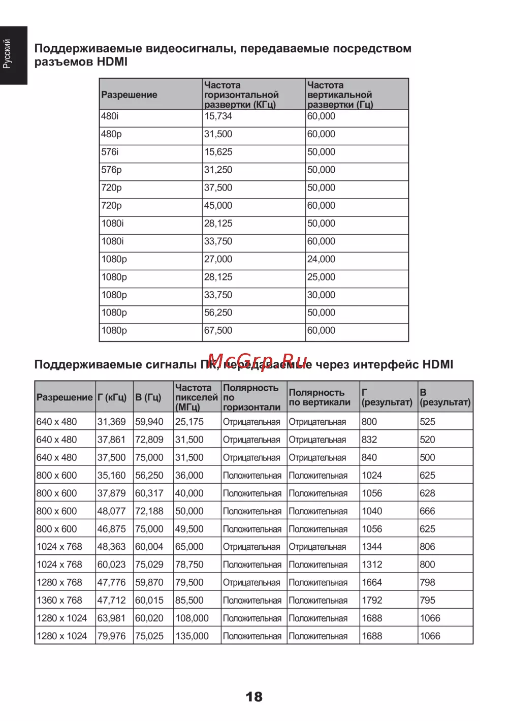 Toshiba 42HL833R [18/67] Поддерживаемые сигналы пк передаваемые через интерфейс hdmi