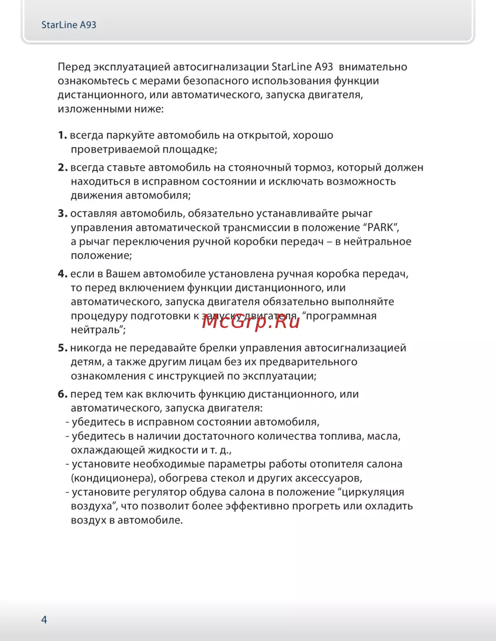Starline a93 can-lin — правила безопасного использования автосигнализации и запуска двигателя [4/115]