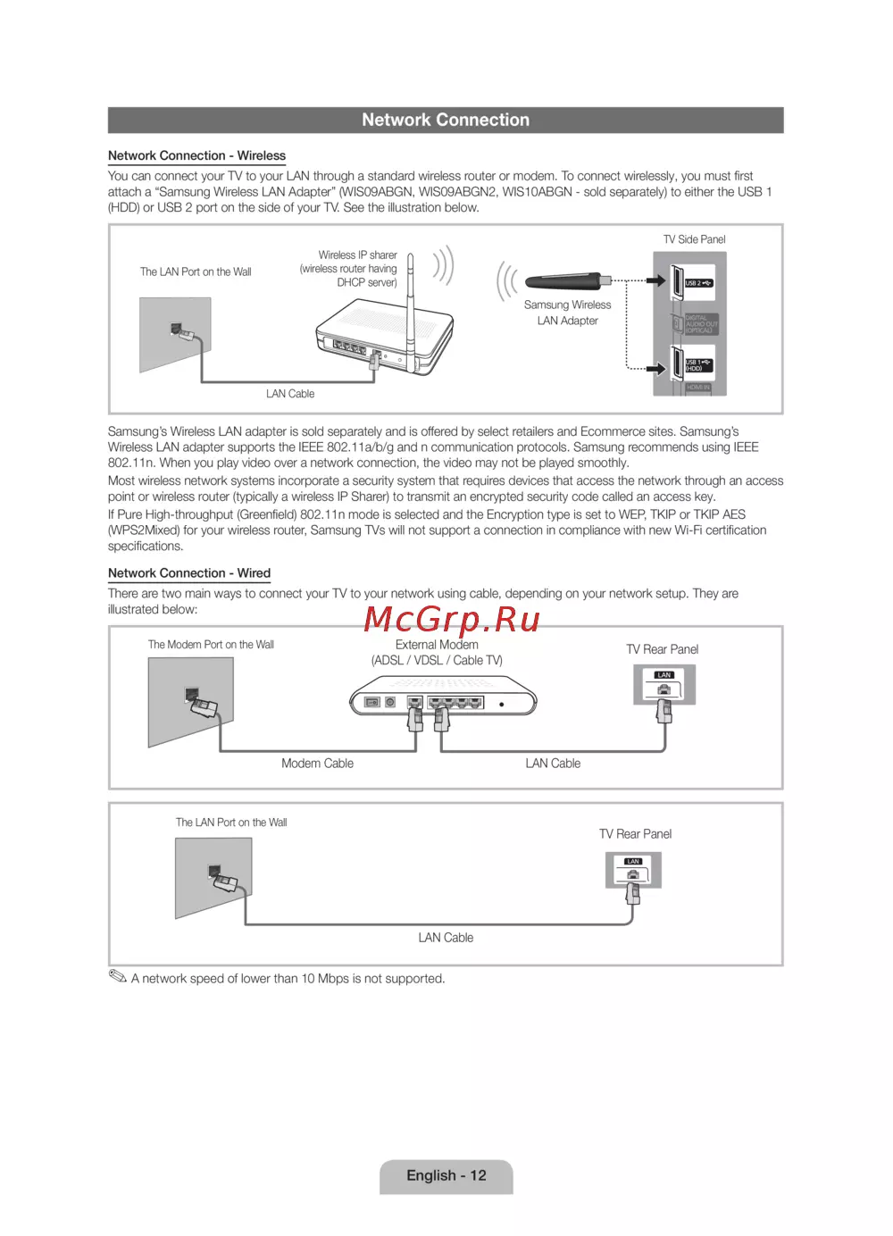 - Samsung сымсыз lan адаптері жеке сатылады және оны бөлшек сауда орталықтарынан не электронды сауда сайттарынан алуға болады samsung сымсыз lan адаптері ieee 802 1a b g және n тілқатысу протоколдарын қолдайды samsung компаниясы ieee 802 1n протоколын қолдануды ұсынады видеоны желі арқылы ойнатқан кезде видео бірқалыпты көрсетілмеуі мүмкін көпшілік сымсыз желілердің желіге кіру протоколы немесе сымсыз роутер әдетте сымсыз ip ортақтастырғышы арқылы кіріп қауіпсіздік коды деп аталатын құпияланған қауіпсіздік кодын жіберетін қауіпсіздік жүйелері болады егер pure high throughput greenfield 802 1n режимі таңдалып сымсыз роутер үшін encryption параметрі wep tkip немесе tkip aes wps2mixed қалпына қойылса samsung теледидары жаңа wi fi сертификаттау стандартына сай келетін қосылымға қолдау көрсетпейді p.66