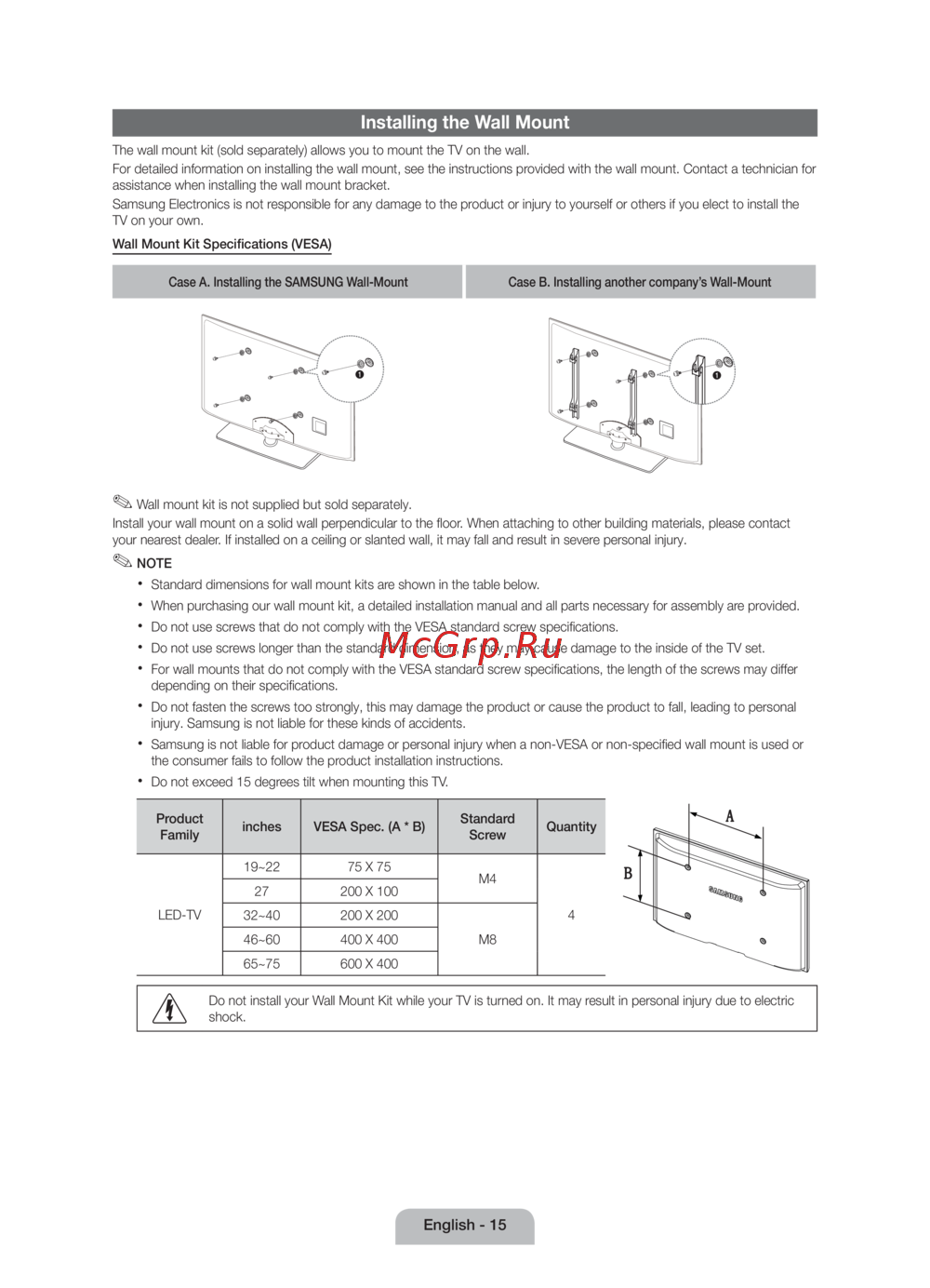 Case A. Installing the SAMSUNG Wall-Mount Case B. Installing another company’s Wall-Mount