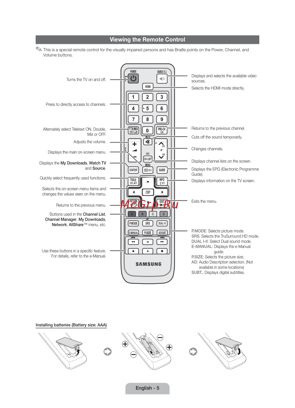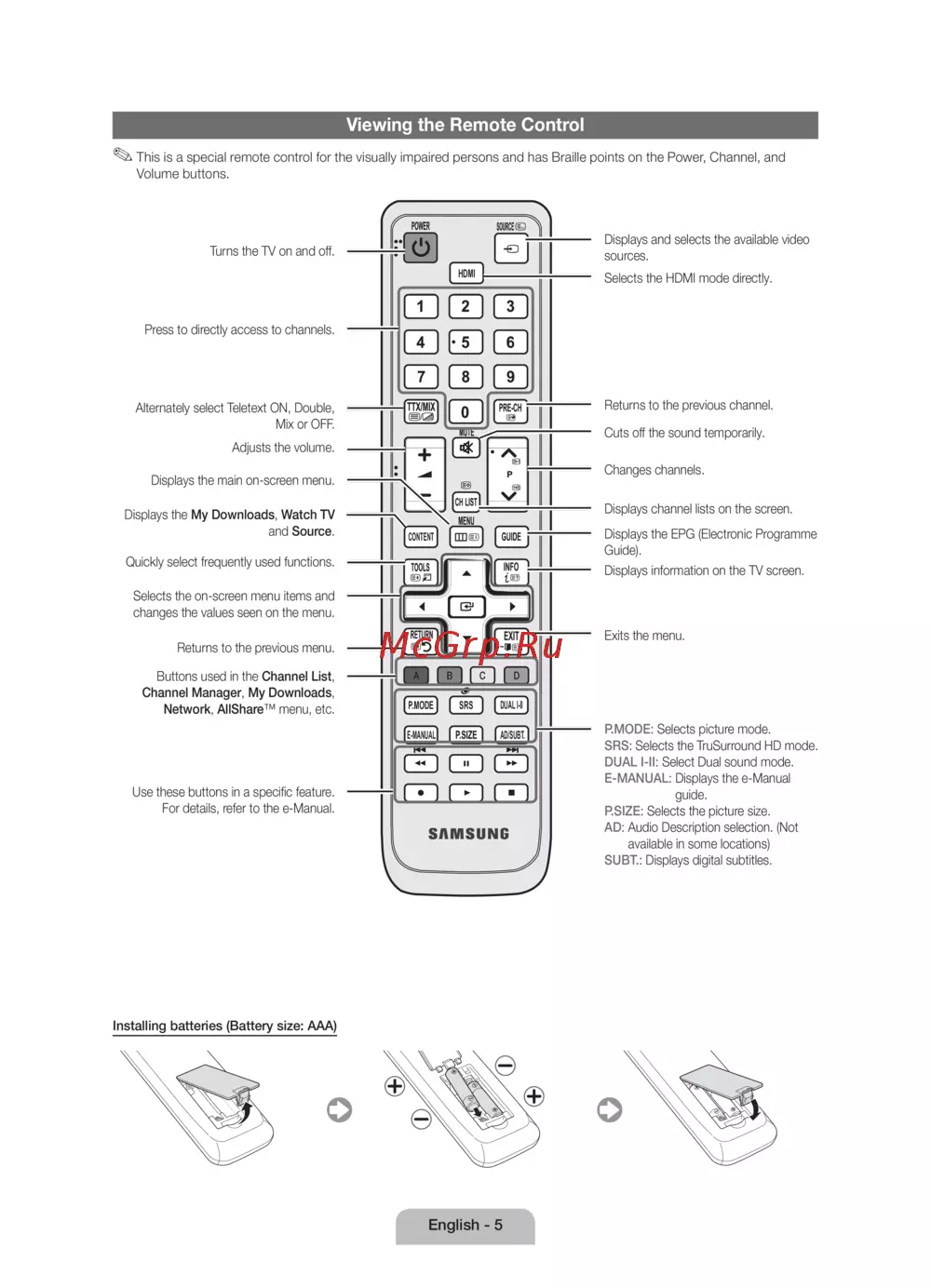 ![Samsung UE40D5000PW [5/73] This is a special remote control for the visually impaired persons and has braille points on the power channel and](/views2/1136508/page5/bg5.png)
