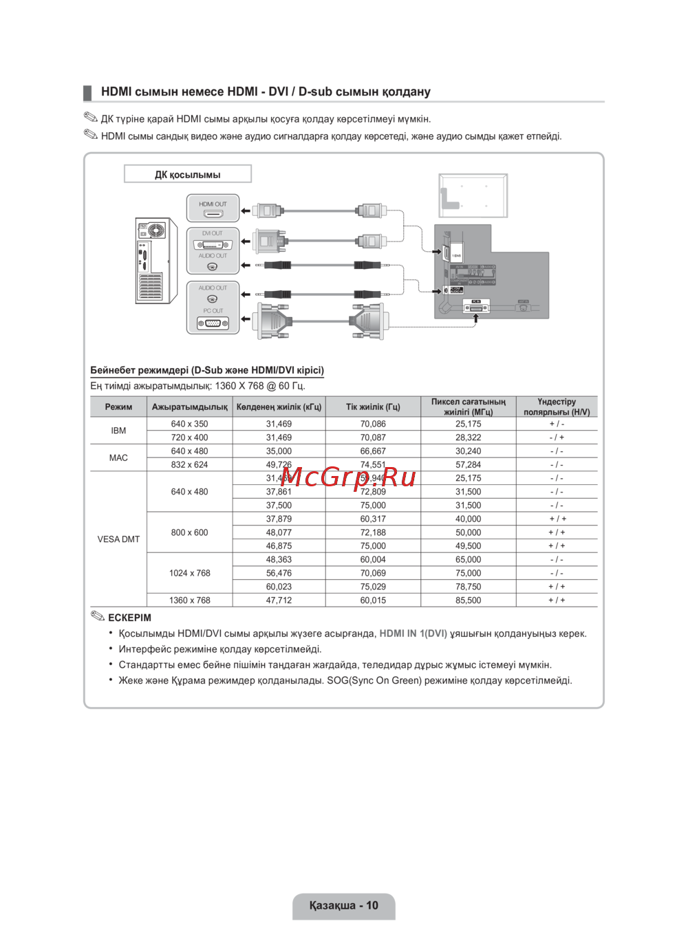 Бейнебет режимдері мен ажыратымдылық параметрлері туралы толық ақпарат. HDMI және D-Sub қосылымдарын тиімді пайдалану үшін қажетті мәліметтер.
