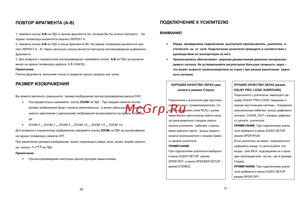 Узнайте, как повторить фрагмент видео и настроить звук на проигрывателе. Пошаговые инструкции по использованию функций ZOOM и подключения к усилителю.