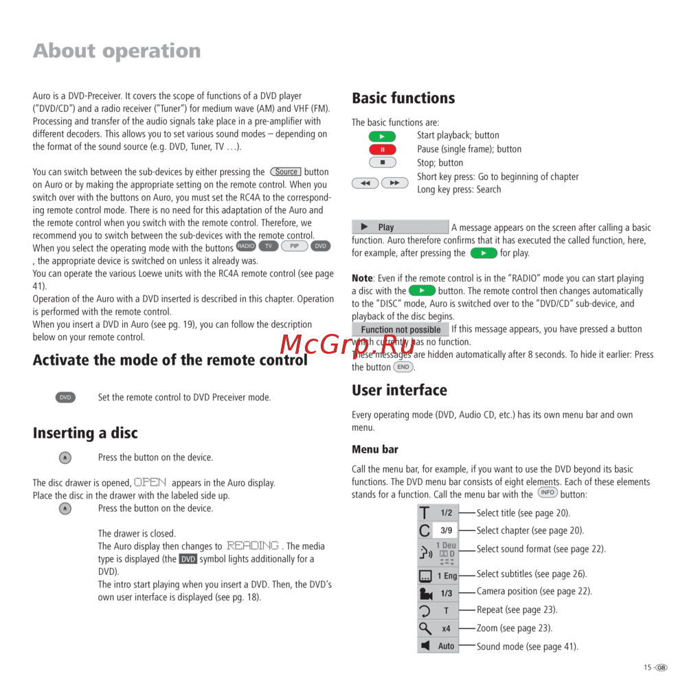 Operation of the Auro with a DVD inserted is described in this chapter. Operation