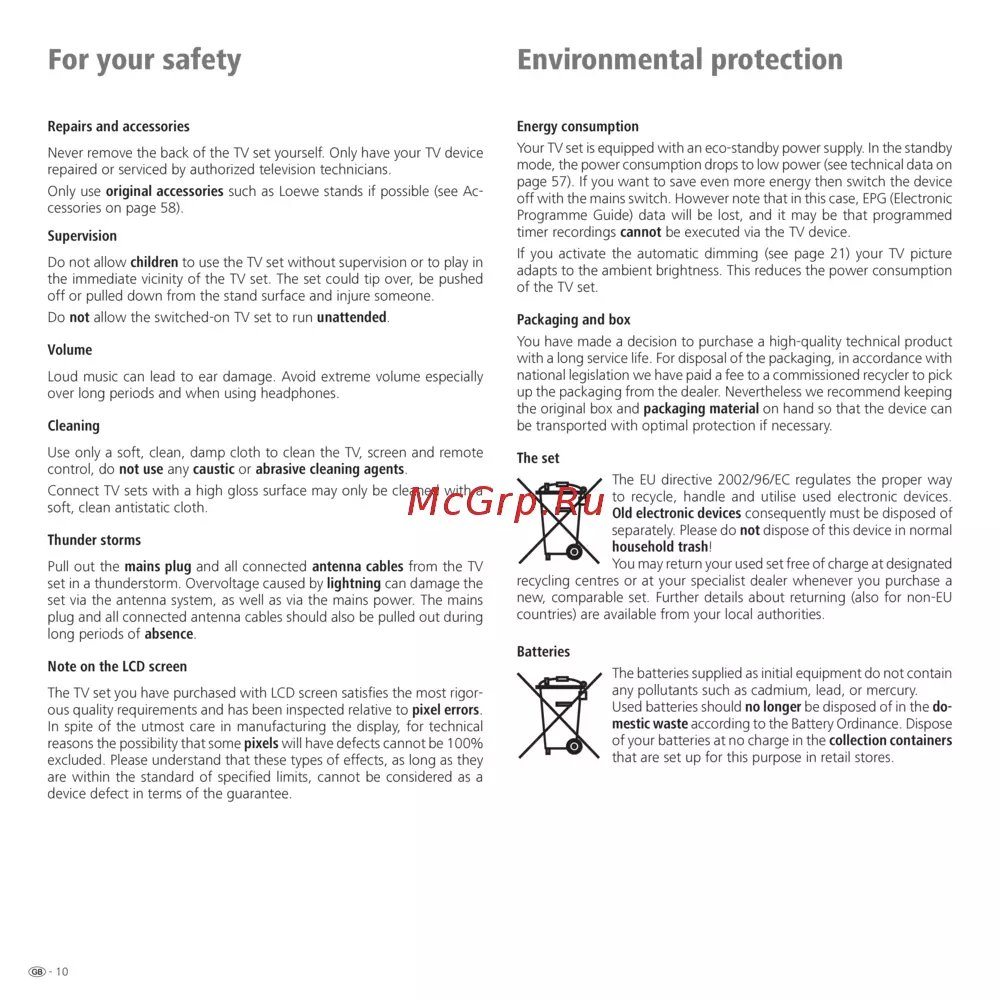 Discover how to save energy with your TV's eco-standby mode, handle batteries safely, dispose of electronics responsibly, ensure child safety, and maintain your device with proper cleaning guidelines. Learn about environmental protection and power consumption reduction.