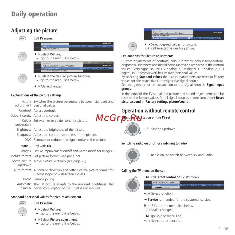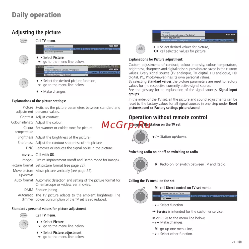 In the index of the TV set, all the picture and sound adjustments can be