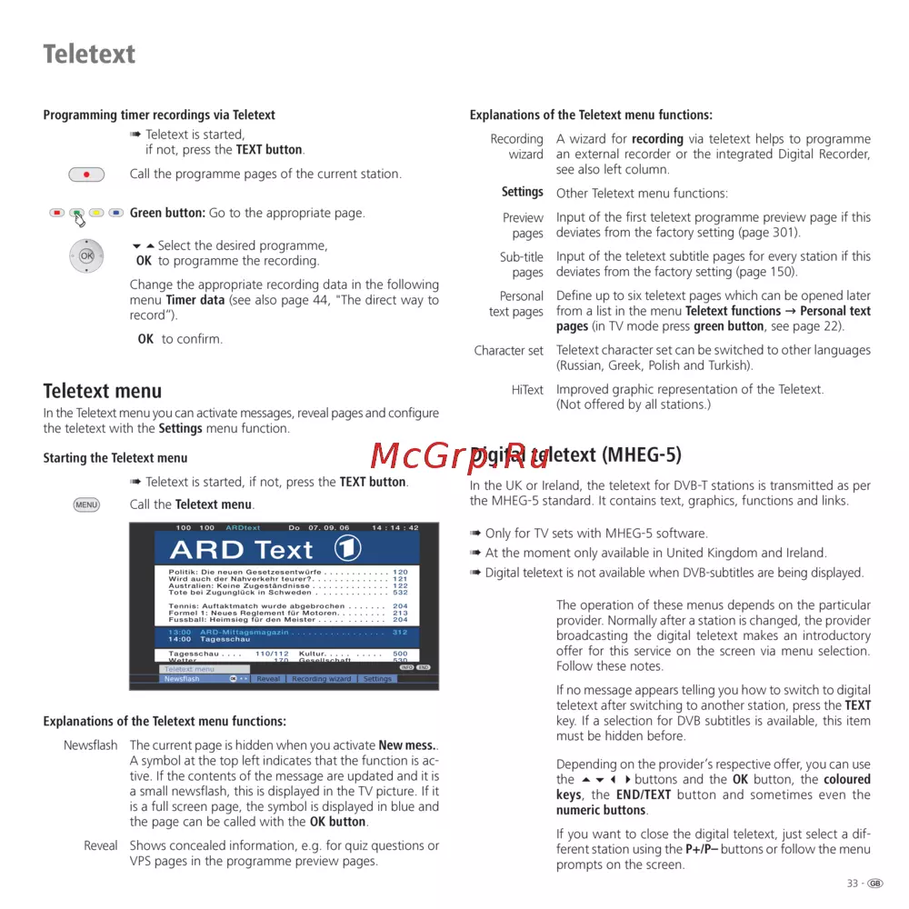 Explanations of the Teletext menu functions: