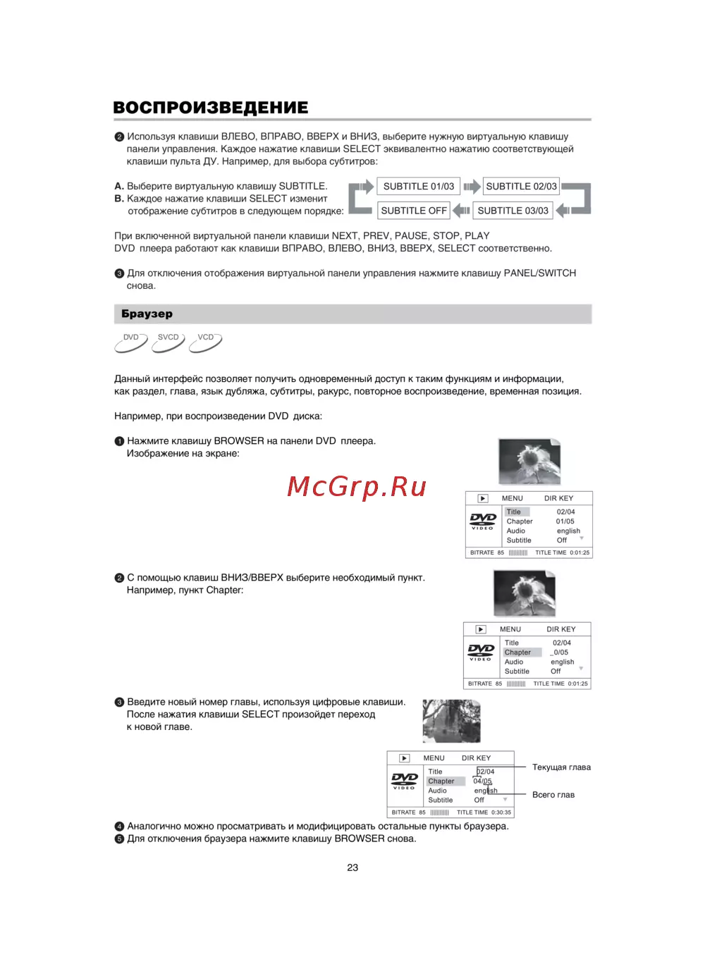 Узнайте, как эффективно управлять воспроизведением и навигацией на DVD плеере с помощью виртуальной панели и клавиш. Получите доступ к субтитрам, главам и другим функциям.