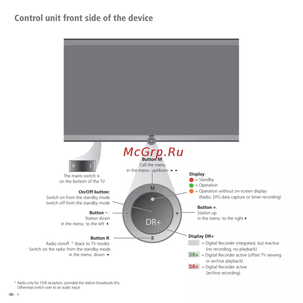 - Thedisplayinthecontrolpanelonthefrontoftheset willbeilluminatedred thesetisnowinstandbymode p.11