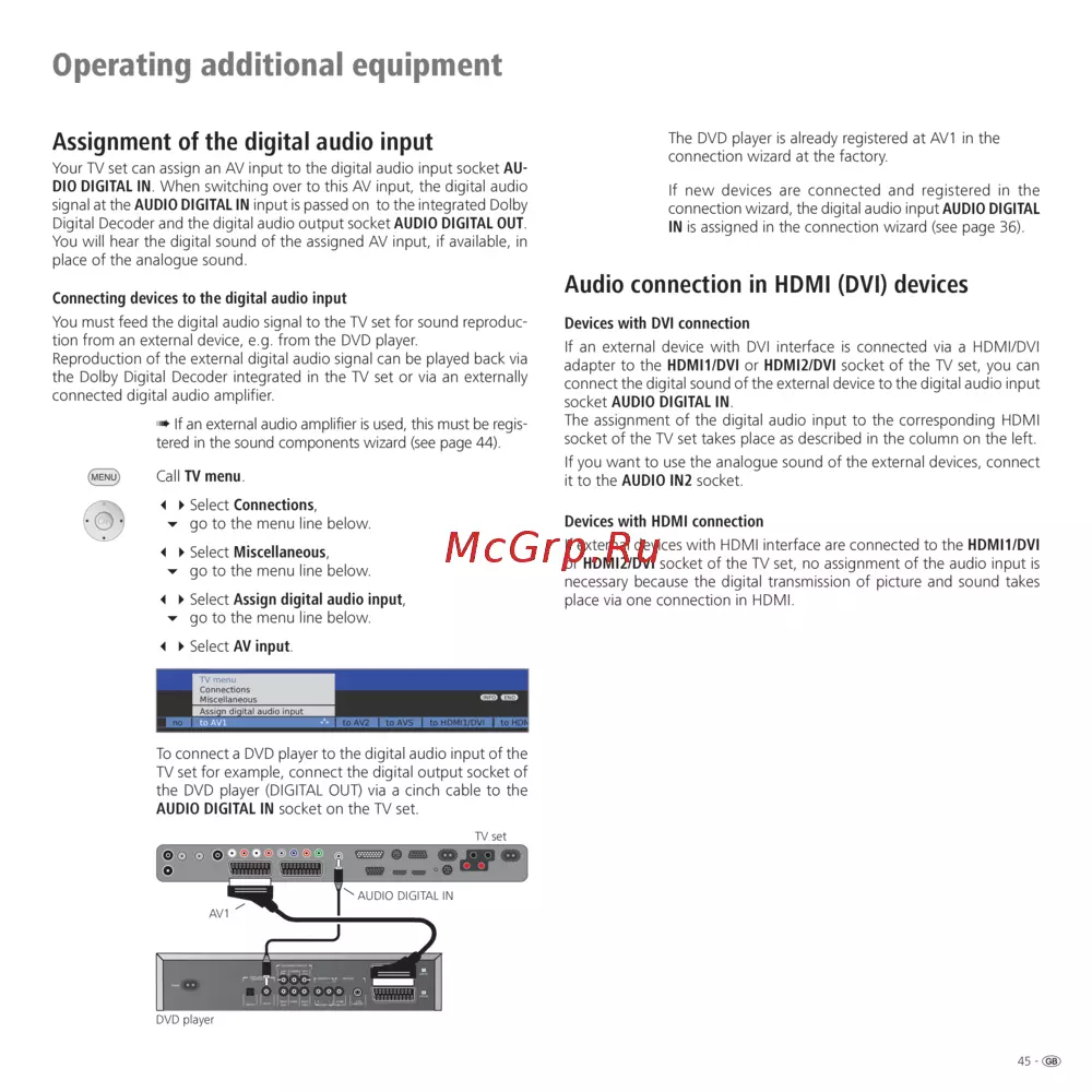 Your TV set can assign an AV input to the digital audio input socket AU-