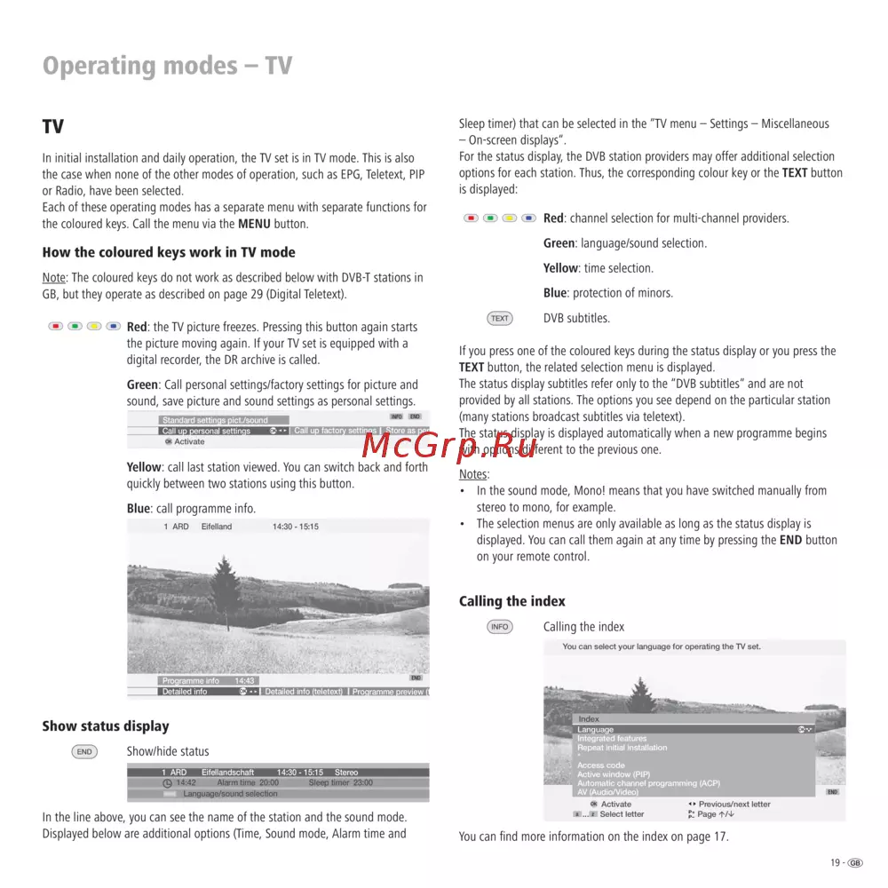 Узнайте о различных режимах работы телевизора, управлении с помощью цветных кнопок, меню настроек и функциях DVB, Teletext для вашего телевизора.