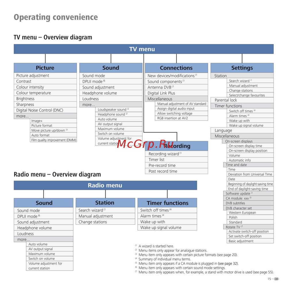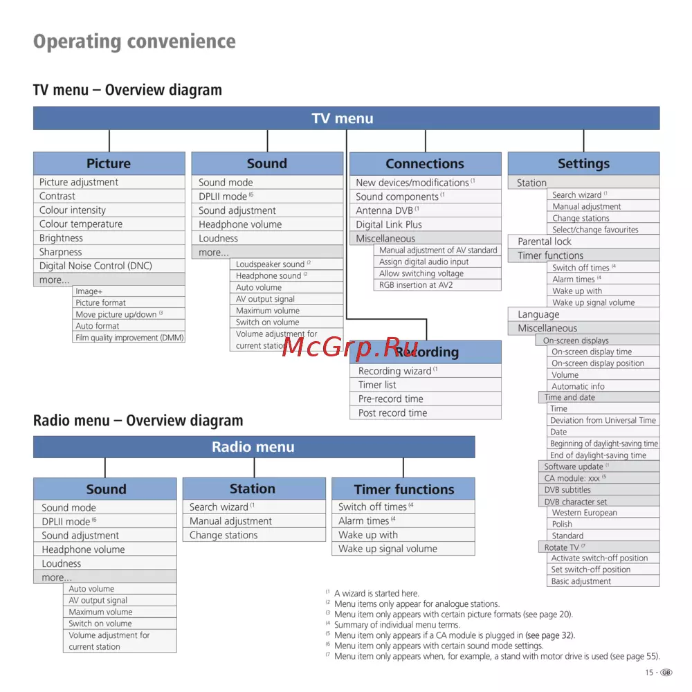 - Radio menu in the radio menu you can set the sound search for and store radio stations automatically or manually change stations and set switch off alarm functions the settings are made the same way they are made in tv mode p.34
