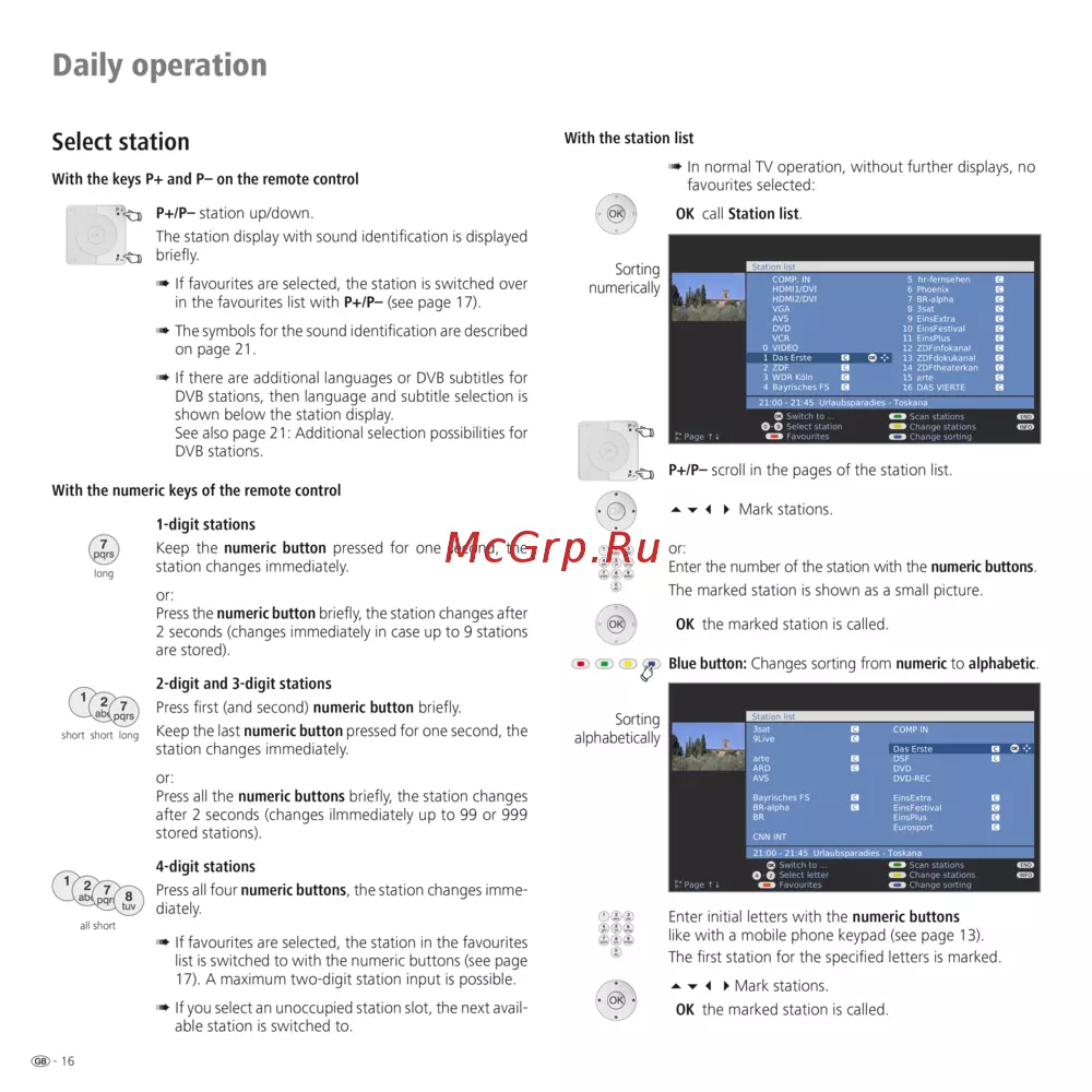P+/P– scroll in the pages of the station list.