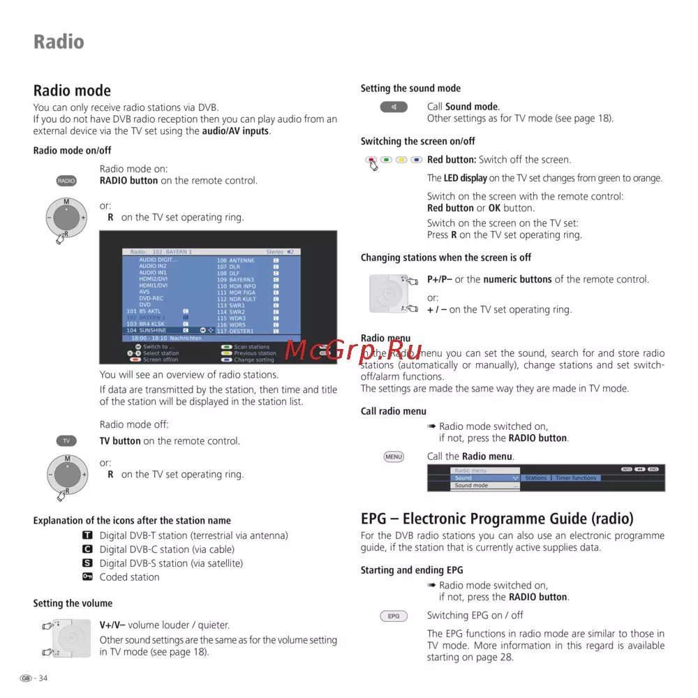 - Starting and ending epg radio mode switched on if not press the radio button p.34