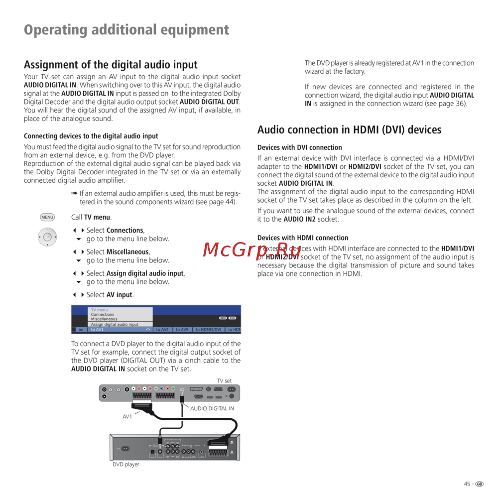 or HDMI2/DVI socket of the TV set, no assignment of the audio input is