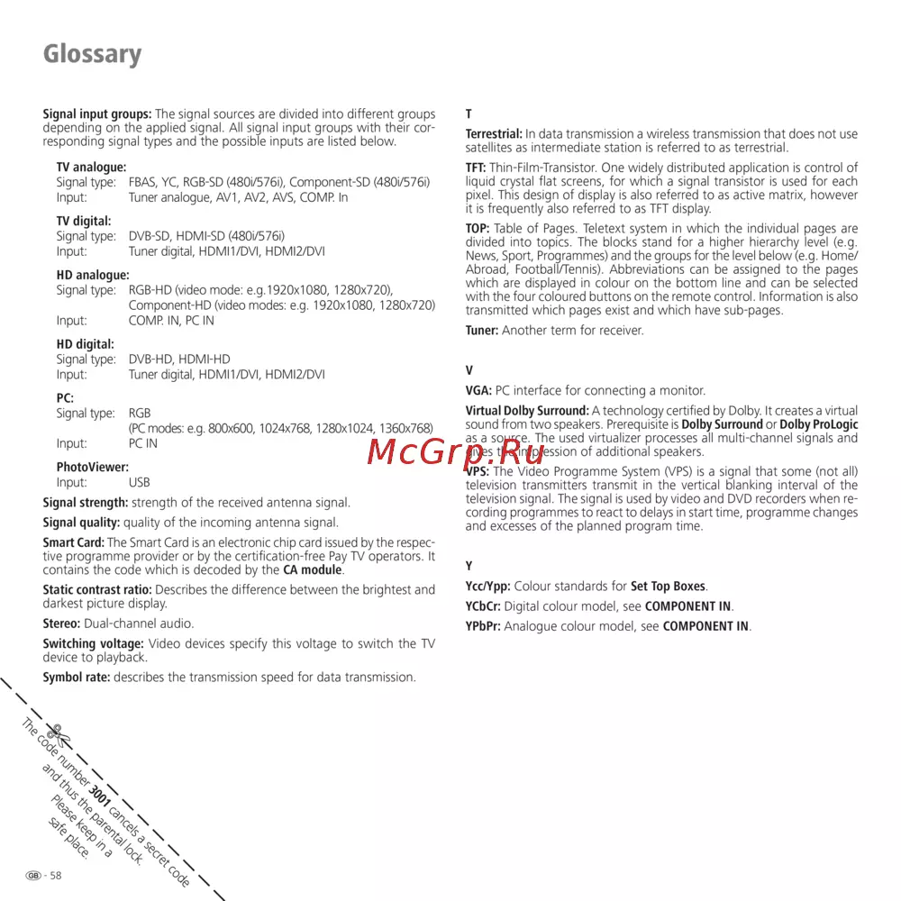 - The code number 3001 cancels a secret code and thus the parental lock please keep in a safe place p.58