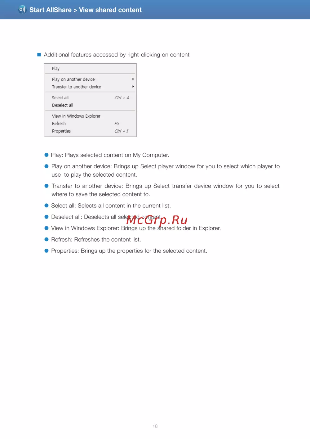 Изучите дополнительные функции управления контентом, включая воспроизведение, передачу и просмотр свойств. Упрощайте работу с вашими файлами и устройствами.
