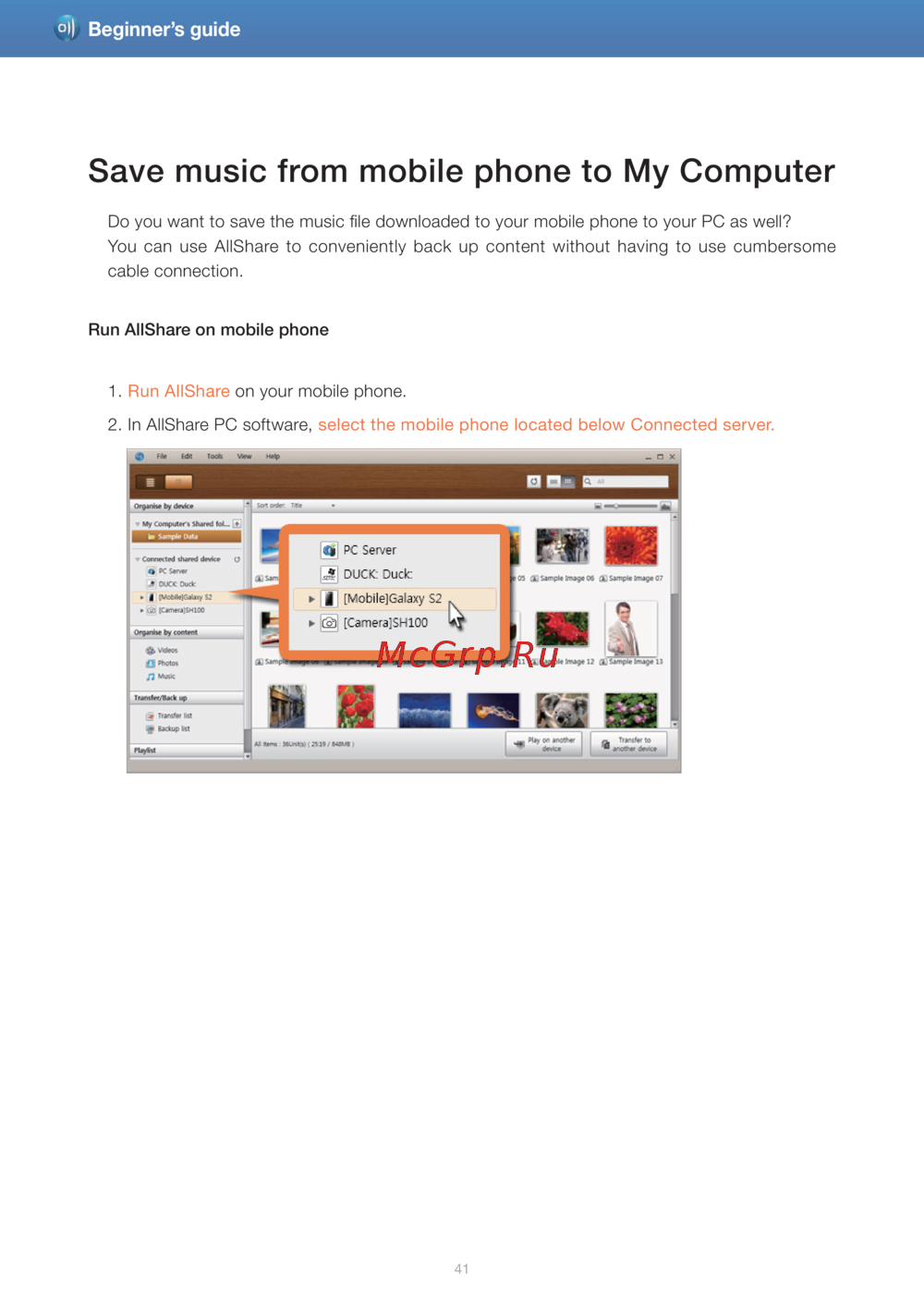 2. In AllShare PC software, select the mobile phone located below Connected server.