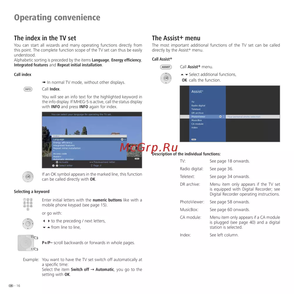 Learn how to easily navigate your TV's functions using the Call Index and Assist+ menu. Simplified remote control access for settings like energy efficiency, language, and more.