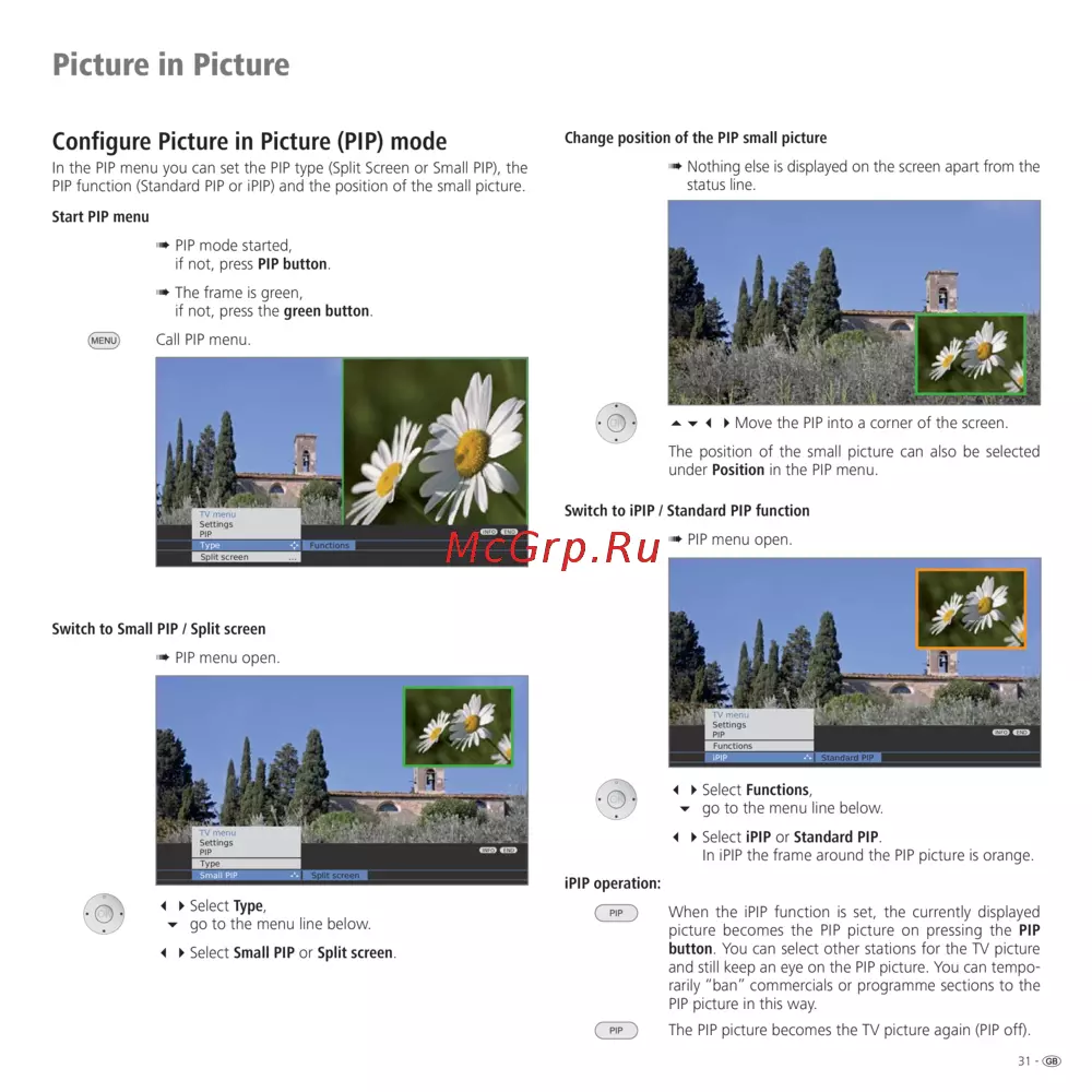 PIP function (Standard PIP or iPIP) and the position of the small picture.