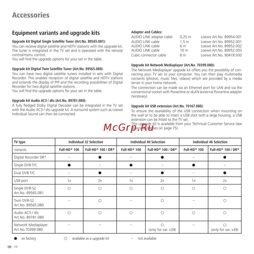 Discover Loewe Individual TV options with Full-HD displays, Digital Recorders, and various upgrade kits. Enhance features like satellite tuners, audio systems, and network media player for a superior viewing experience.