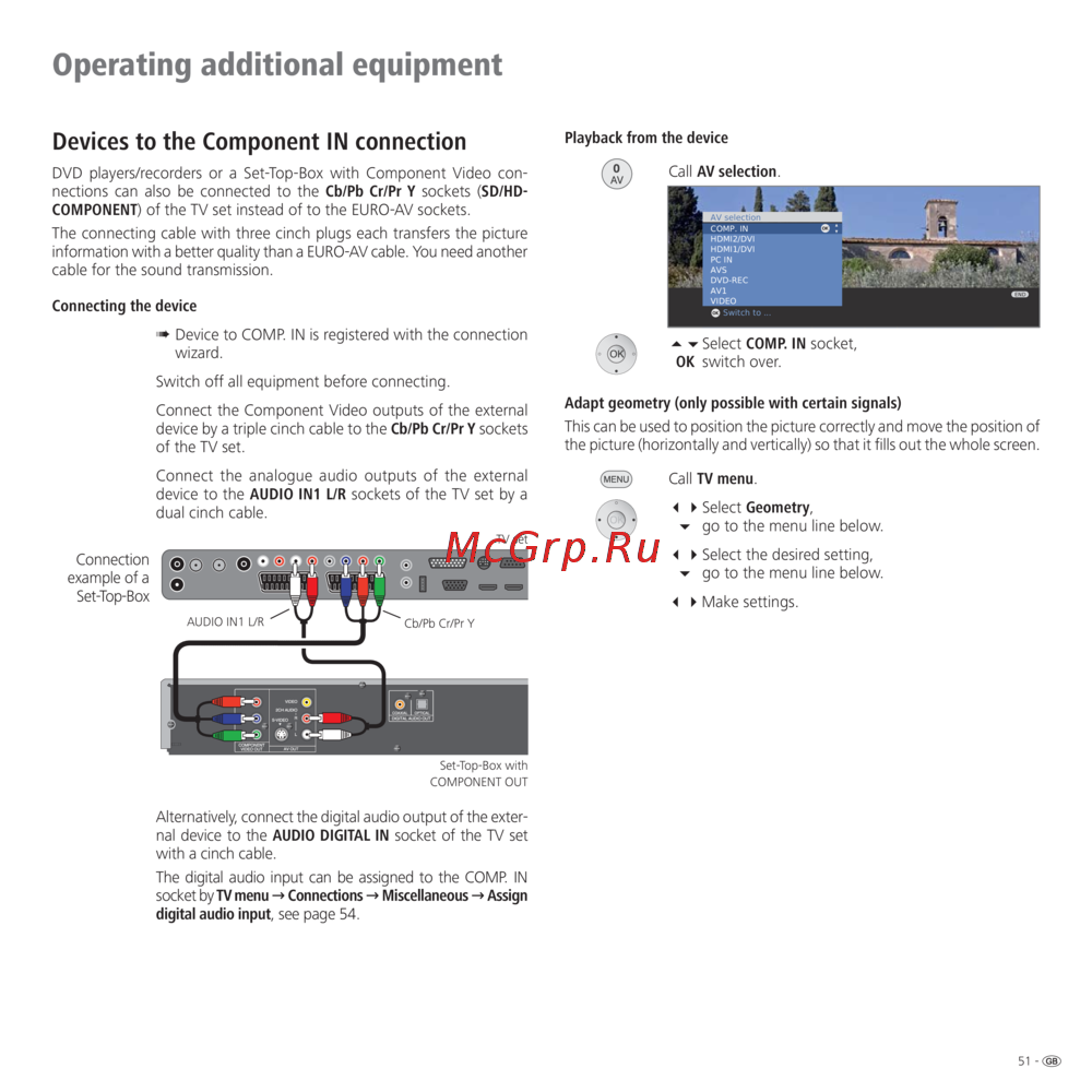 COMPONENT) of the TV set instead of to the EURO-AV sockets.