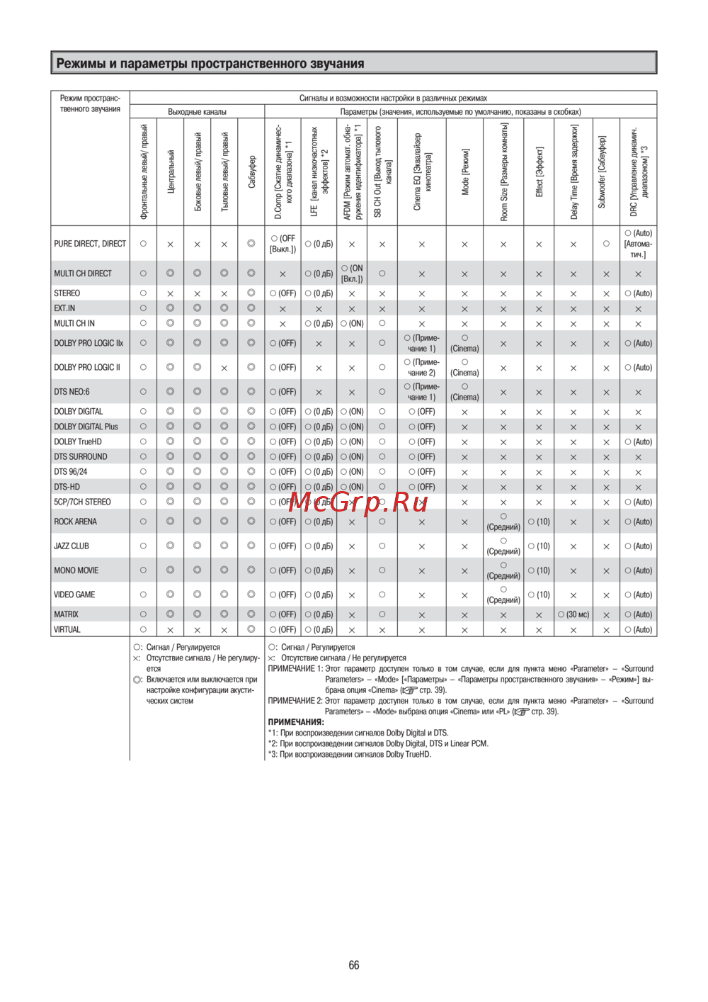 - Отличия названий режимов пространственного звучания в зависимости от входных сигналов p.72