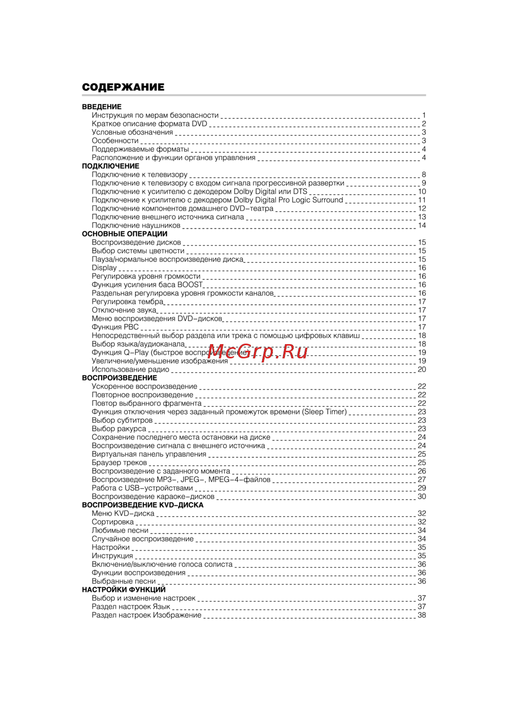 СОДЕРЖАНИЕ ВВЕДЕНИЕ Инструкция по мерам безопасности Краткое описание формата DVD Условные обозначения Особенности Поддерживаемые форматы Расположение и функции органов управления 1 2 3 3 4 4 ПОДКЛЮЧЕНИЕ Подключение к телевизору Подключение к телевизору с входом сигнала прогрессивной развертки Подключение к усилителю с декодером Dolby Digital или DTS Подключение к усилителю с декодером Dolby Digital Pro Logic Surround Подключение компонентов домашнего DVD театра Подключение внешнего источника сигнала Подключение наушников 8 9 10 11 12 13 14 ОСНОВНЫЕ ОПЕРАЦИИ Воспроизведение дисков 15 Выбор системы цветности 15 Пауза нормальное воспроизведение диска 15 Display____________________________________________________________________________________16 Регулировка уровня громкости 16 Функция усиления баса BOOST 16 Раздельная регулировка уровня громкости каналов 16 Регулировка тембра 17 Отключение звука 17 Меню воспроизведения DVD дисков 17 Функция РВС 17 Непосредственный выбор раздела или трека с помощью цифровых клавиш 18 Выбор языка аудиоканала 18 Функция Q Play быстрое воспроизведение 19 Увеличение уменьшение изображения 19 Использование радио 20 ВОСПРОИЗВЕДЕНИЕ Ускоренное воспроизведение 22 Повторное воспроизведение 22 Повтор выбранного фрагмента 22 Функция отключения через заданный промежуток времени Sleep Timer 23 Выбор субтитров 23 Выбор ракурса_____________________________________________________________________________ 23 Сохранение последнего места остановки на диске 24 Воспроизведение сигнала с внешнего источника 24 Виртуальная панель управления 25 Браузер треков 25 Воспроизведение с заданного момента 26 Воспроизведение MP3 JPEG MPEG 4 файлов 27 Работа с USB устройствами 29 Воспроизведение караоке дисков 30 ВОСПРОИЗВЕДЕНИЕ KVD ДИСКА Меню KVD диска Сортировка Любимые песни Случайное воспроизведение Настройки Инструкция Включение выключение голоса солиста Функции воспроизведения Выбранные песни 32 32 34 34 35 35 36 36 36 НАСТРОЙКИ ФУНКЦИЙ Выбор и изменение настроек Раздел настроек Язык Раздел настроек Изображение 37 37 38