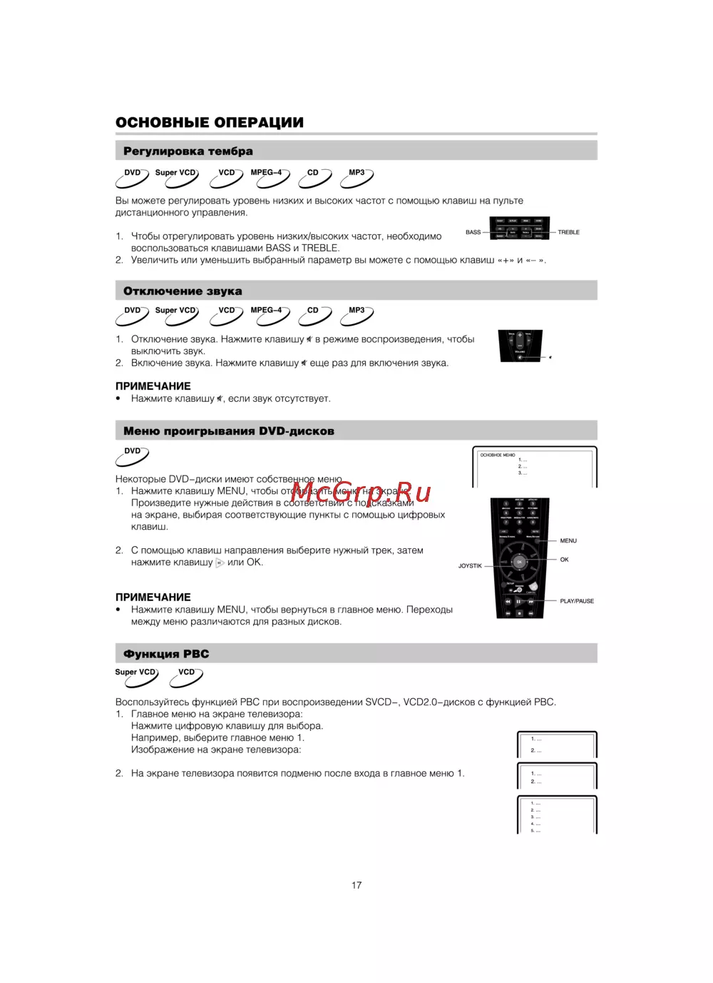 ОСНОВНЫЕ ОПЕРАЦИИ Регулировка тембра DVD Super VCD Вы можете регулировать уровень низких и высоких частот с помощью клавиш на пульте дистанционного управления 1 Чтобы отрегулировать уровень низких высоких частот необходимо BASS воспользоваться клавишами BASS и TREBLE 2 Увеличить или уменьшить выбранный параметр вы можете с помощью клавиш и TREBLE Отключение звука 1 Отключение звука Нажмите клавишу в режиме воспроизведения чтобы выключить звук 2 Включение звука Нажмите клавишу еще раз для включения звука ПРИМЕЧАНИЕ Нажмите клавишу если звук отсутствует Меню проигрывания DVD дисков ОСНОВНОЕ МЕНЮ Некоторые DVD диски имеют собственное меню 1 Нажмите клавишу MENU чтобы отобразить меню на экране Произведите нужные действия в соответствии с подсказками на экране выбирая соответствующие пункты с помощью цифровых клавиш MENU 2 С помощью клавиш направления выберите нужный трек затем нажмите клавишу или ОК OK JOYSTIK ПРИМЕЧАНИЕ PLAY PAUSE Нажмите клавишу MENU чтобы вернуться в главное меню Переходы между меню различаются для разных дисков Функция РВС Super VCD Воспользуйтесь функцией РВС при воспроизведении SVCD VCD2 0 дисков с функцией РВС 1 Главное меню на экране телевизора Нажмите цифровую клавишу для выбора Например выберите главное меню 1 Изображение на экране телевизора 2 На экране телевизора появится подменю после входа в главное меню 1 17