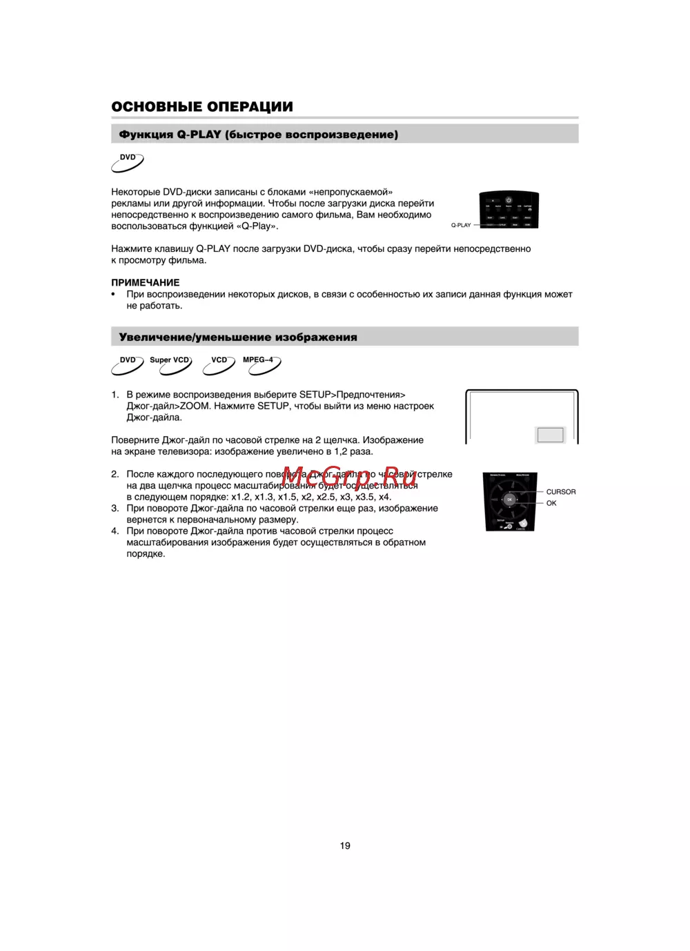 ОСНОВНЫЕ ОПЕРАЦИИ Функция Q PLAY быстрое воспроизведение DVD Некоторые О О диски записаны с блоками непропускаемой рекламы или другой информации Чтобы после загрузки диска перейти непосредственно к воспроизведению самого фильма Вам необходимо воспользоваться функцией О Р1ау Нажмите клавишу О РЬАУ после загрузки ОУД диска чтобы сразу перейти непосредственно к просмотру фильма ПРИМЕЧАНИЕ При воспроизведении некоторых дисков в связи с особенностью их записи данная функция может не работать Увеличение уменьшение изображения DVD Super VCD_ VCD MPEG 4 1 В режиме воспроизведения выберите ЗЕТиР Предпочтения Джог дайл гООМ Нажмите SETUP чтобы выйти из меню настроек Джог дайла Поверните Джог дайл по часовой стрелке на 2 щелчка Изображение на экране телевизора изображение увеличено в 1 2 раза 2 После каждого последующего поворота Джог дайла по часовой стрелке на два щелчка процесс масштабирования будет осуществляться в следующем порядке х1 2 х1 3 х1 5 х2 х2 5 хЗ х3 5 х4 3 При повороте Джог дайла по часовой стрелки еще раз изображение вернется к первоначальному размеру 4 При повороте Джог дайла против часовой стрелки процесс масштабирования изображения будет осуществляться в обратном порядке 19