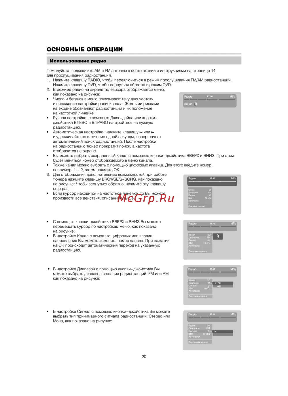 ОСНОВНЫЕ ОПЕРАЦИИ Использование радио Пожалуйста подключите АМ и FM антенны в соответствии с инструкциями на странице 14 для прослушивания радиостанций 1 Нажмите клавишу RADIO чтобы переключиться в режим прослушивания FM AM радиостанций Нажмите клавишу DVD чтобы вернуться обратно в режим DVD 2 В режиме радио на экране телевизора отображается меню как показано на рисунке Число и бегунок в меню показывают текущую частоту и положение настройки радиоканала Желтыми рисками на экране обозначают радиостанции и их положение на частотной линейке Ручная настройка с помощью Джог дайла или кнопкиджойстика ВЛЕВО и ВПРАВО настройтесь на нужную радиостанцию Автоматическая настройка нажмите клавишу или н и удерживайте ее в течение одной секунды тюнер начнет автоматический поиск радиостанций После настройки на радиостанцию тюнер прекратит поиск а частота отобразится на экране Вы можете выбрать сохраненный канал с помощью кнопки джойстика ВВЕРХ и ВНИЗ При этом будет меняться номер отображаемого в меню канала Также канал можно выбрать с помощью цифровых клавиш Для этого введите номер например 1 2 затем нажмите ОК Для отображения дополнительных возможностей при работе Радио 87 50 тюнера нажмите клавишу BROWSE S SONG как показано на рисунке Чтобы вернуться обратно нажмите эту клавишу еще раз Канал 20 Диапазон FM Если курсор находится на частотной линейке то Вы можете Сигнал С Шаг 10 кГц произвести все действия описанные выше Сохранить канал С помощью кнопки джойстика ВВЕРХ и ВНИЗ Вы можете перемещать курсор по настройкам меню как показано на рисунке В настройке Канал с помощью цифровых или клавиш направления Вы можете изменить номер канала При нажатии на ОК происходит автоматический переход на указанную радиостанцию В настройке Диапазон с помощью кнопки джойстика Вы можете выбрать диапазон вещания радиостанций ЕМ или АМ как показано на рисунке В настройке Сигнал с помощью кнопки джойстика Вы можете выбрать тип принимаемого сигнала радиостанций Стерео или Моно как показано на рисунке 20 МГц