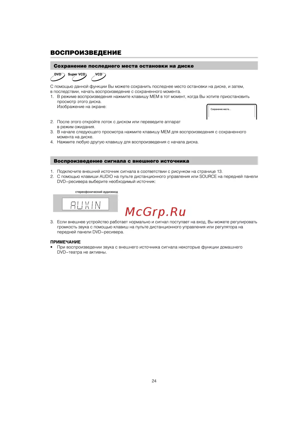 ВОСПРОИЗВЕДЕНИЕ Сохранение последнего места остановки на диске DVD Super VCD VCD С помощью данной функции Вы можете сохранить последнее место остановки на диске и затем в последствии начать воспроизведение с сохраненного момента 1 В режиме воспроизведения нажмите клавишу МЕМ в тот момент когда Вы хотите приостановить просмотр этого диска ____________________ Изображение на экране СПХПАИАЫИА МАПТА Сохранение места 2 После этого откройте лоток с диском или переведите аппарат в режим ожидания 3 В начале следующего просмотра нажмите клавишу МЕМ для воспроизведения с сохраненного момента на диске 4 Нажмите любую другую клавишу для воспроизведения с начала диска Воспроизведение сигнала с внешнего источника 1 Подключите внешний источник сигнала в соответствии с рисунком на странице 13 2 С помощью клавиши AUDIO на пульте дистанционного управления или SOURCE на передней панели DVD ресивера выберите необходимый источник стереофонический аудиовход 3 Если внешнее устройство работает нормально и сигнал поступает на вход Вы можете регулировать громкость звука с помощью клавиш на пульте дистанционного управления или регулятора на передней панели ОУО ресивера ПРИМЕЧАНИЕ При воспроизведении звука с внешнего источника сигнала некоторые функции домашнего ОМО театра не активны 24