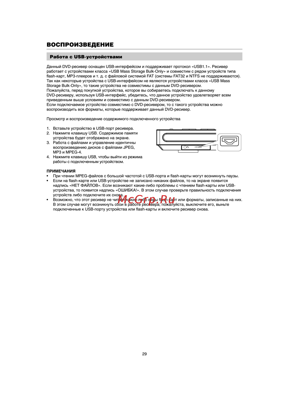 ВОСПРОИЗВЕДЕНИЕ Работа с USB устройствами Данный DVD ресивер оснащен USB интерфейсом и поддерживает протокол USB1 1 Ресивер работает с устройствами класса USB Mass Storage Bulk Only и совместим с рядом устройств типа flash карт МРЗ плееров и т д с файловой системой FAT системы FAT32 и NTFS не поддерживаются Так как некоторые устройства с USB интерфейсом не являются устройствами класса USB Mass Storage Bulk Only то такие устройства не совместимы с данным DVD ресивером Пожалуйста перед покупкой устройства которое вы собираетесь подключать к данному DVD ресиверу используя USB интерфейс убедитесь что данное устройство удовлетворяет всем приведенным выше условиям и совместимо с данным DVD ресивером Если подключаемое устройство совместимо с DVD ресивером то с такого устройства можно воспроизводить все форматы которые поддерживает данный DVD ресивер Просмотр и воспроизведение содержимого подключенного устройства 1 Вставьте устройство в USB порт ресивера 2 Нажмите клавишу USB Содержимое памяти устройства будет отображено на экране 3 Работа с файлами и управление идентичны воспроизведению дисков с файлами JPEG MP3 и MPEG 4 4 Нажмите клавишу USB чтобы выйти из режима работы с подключенным устройством ПРИМЕЧАНИЯ При чтении МРЕв файлов с большой частотой с иЗВ порта и НазИ карты могут возникнуть паузы Если на ЛазИ карте или иЗВ устройстве не записано никаких файлов то на экране появится надпись НЕТ ФАЙЛОВ Если возникают какие либо проблемы с чтением НазИ карты или иБВустройства то появится надпись ОШИБКА В этом случае проверьте правильность подключения устройств либо подключите их снова Возможно что этот ресивер не читает какие либо виды ЯазИ карт или форматы записанные на них В этом случае могут возникнуть сбои в работе ресивера пожалуйста выключите его выньте подключенные к иЗВ порту устройства или flash кapты и включите ресивер снова 29