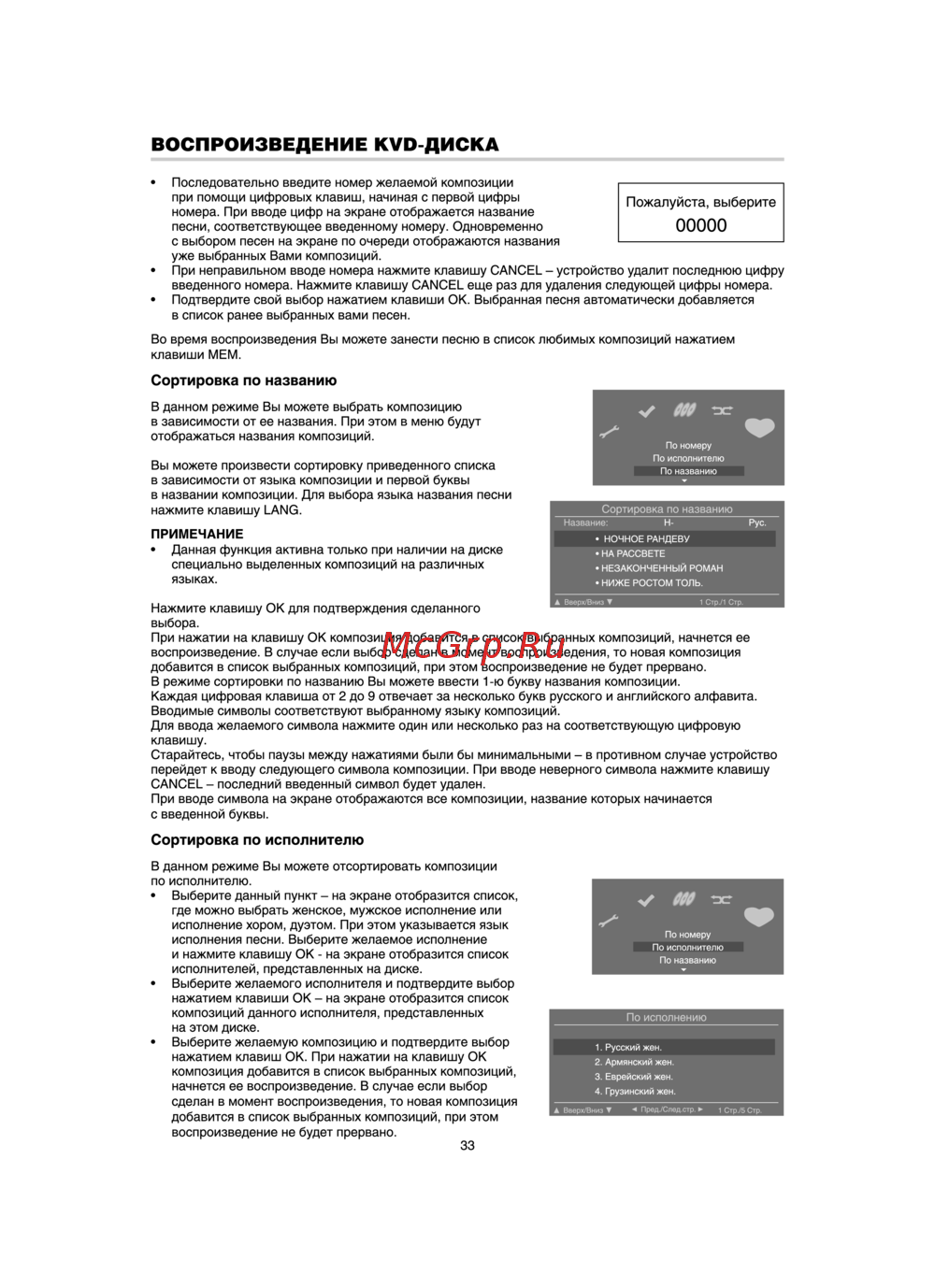 ВОСПРОИЗВЕДЕНИЕ KVD ДИСКА Последовательно введите номер желаемой композиции при помощи цифровых клавиш начиная с первой цифры Пожалуйста выберите номера При вводе цифр на экране отображается название песни соответствующее введенному номеру Одновременно 00000 с выбором песен на экране по очереди отображаются названия уже выбранных Вами композиций При неправильном вводе номера нажмите клавишу CANCEL устройство удалит последнюю цифру введенного номера Нажмите клавишу CANCEL еще раз для удаления следующей цифры номера Подтвердите свой выбор нажатием клавиши ОК Выбранная песня автоматически добавляется в список ранее выбранных вами песен Во время воспроизведения Вы можете занести песню в список любимых композиций нажатием клавиши МЕМ Сортировка по названию В данном режиме Вы можете выбрать композицию в зависимости от ее названия При этом в меню будут отображаться названия композиций Вы можете произвести сортировку приведенного списка в зависимости от языка композиции и первой буквы в названии композиции Для выбора языка названия песни нажмите клавишу LANG ПРИМЕЧАНИЕ Данная функция активна только при наличии на диске специально выделенных композиций на различных языках НОЧНОЕ РАНДЕВУ НА РАССВЕТЕ НЕЗАКОНЧЕННЫЙ РОМАН НИЖЕ РОСТОМ ТОЛЬ Ж Вверх Вниз 1 Стр 1 Стр Нажмите клавишу ОК для подтверждения сделанного выбора При нажатии на клавишу ОК композиция добавится в список выбранных композиций начнется ее воспроизведение В случае если выбор сделан в момент воспроизведения то новая композиция добавится в список выбранных композиций при этом воспроизведение не будет прервано В режиме сортировки по названию Вы можете ввести 1 ю букву названия композиции Каждая цифровая клавиша от 2 до 9 отвечает за несколько букв русского и английского алфавита Вводимые символы соответствуют выбранному языку композиций Для ввода желаемого символа нажмите один или несколько раз на соответствующую цифровую клавишу Старайтесь чтобы паузы между нажатиями были бы минимальными в противном случае устройство перейдет к вводу следующего символа композиции При вводе неверного символа нажмите клавишу CANCEL последний введенный символ будет удален При вводе символа на экране отображаются все композиции название которых начинается с введенной буквы Сортировка по исполнителю В данном режиме Вы можете отсортировать композиции по исполнителю Выберите данный пункт на экране отобразится список где можно выбрать женское мужское исполнение или исполнение хором дуэтом При этом указывается язык исполнения песни Выберите желаемое исполнение и нажмите клавишу ОК на экране отобразится список исполнителей представленных на диске Выберите желаемого исполнителя и подтвердите выбор нажатием клавиши ОК на экране отобразится список композиций данного исполнителя представленных на этом диске Выберите желаемую композицию и подтвердите выбор нажатием клавиш ОК При нажатии на клавишу ОК композиция добавится в список выбранных композиций начнется ее воспроизведение В случае если выбор сделан в момент воспроизведения то новая композиция добавится в список выбранных композиций при этом воспроизведение не будет прервано 33 ое По номеру По исполнителю По названию По исполнению 1 Русский жен 2 Армянский жен 3 Еврейский жен 4 Грузинский жен Ж Вверх Вниз Пред Сле